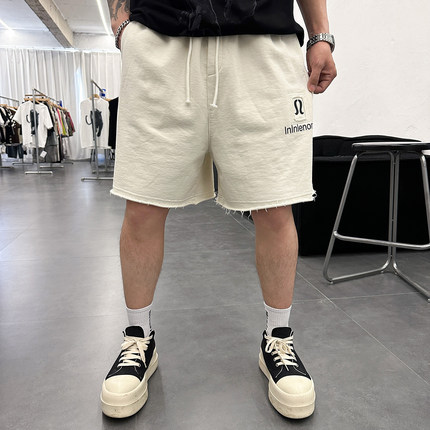 潮流新款重磅五分裤男脚口毛边卷边设计磨破胶印裤子外穿宽松短裤