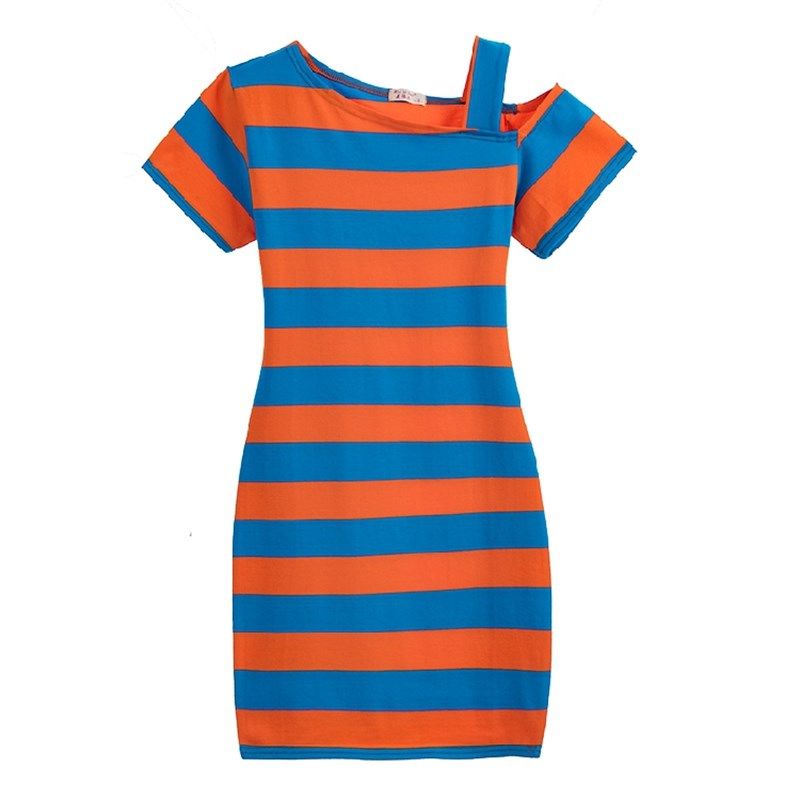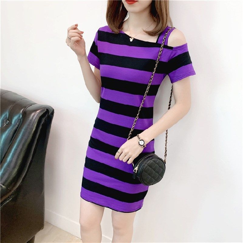 夏装新款中长连衣裙棉睡裙女斜肩收腰显瘦性气质彩条纹短袖外打底