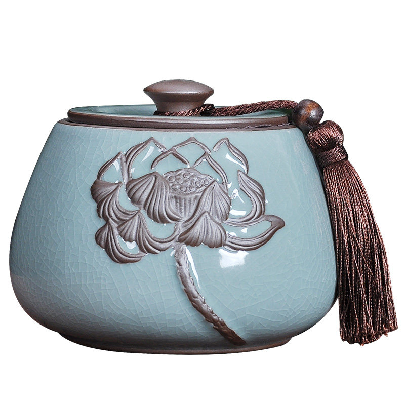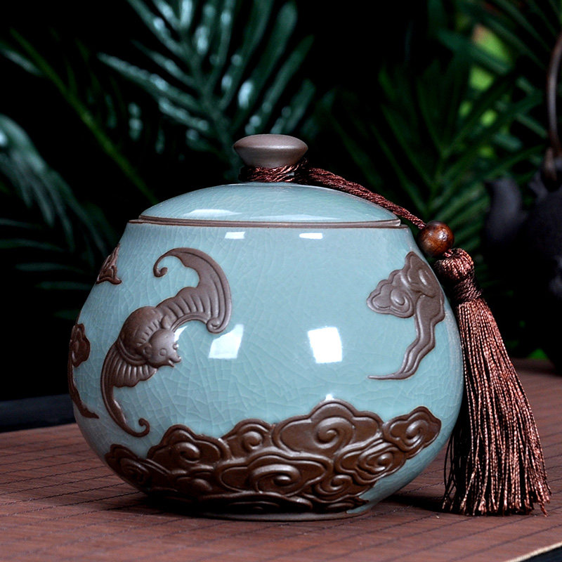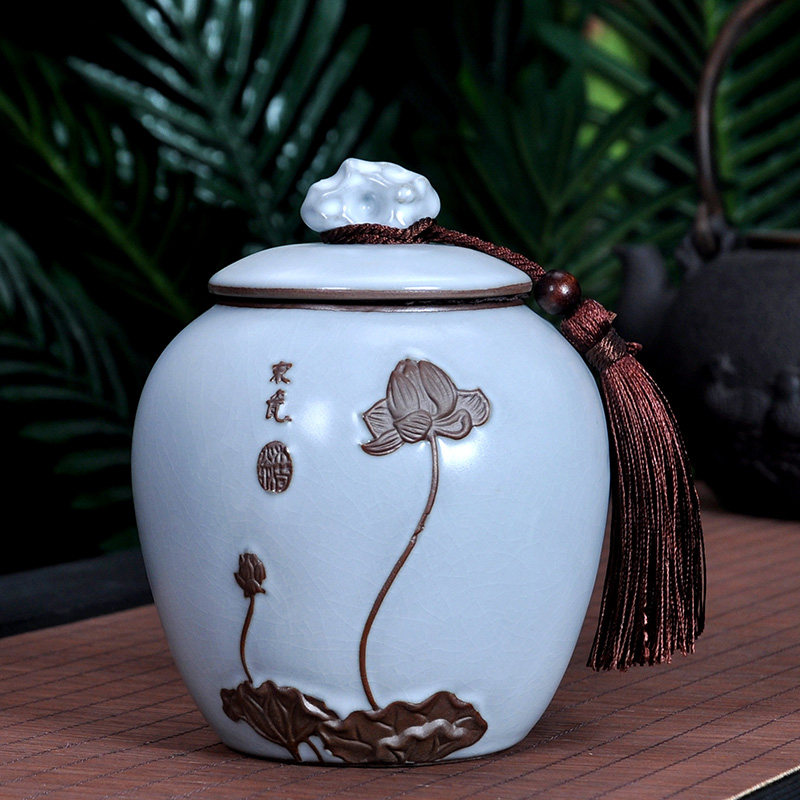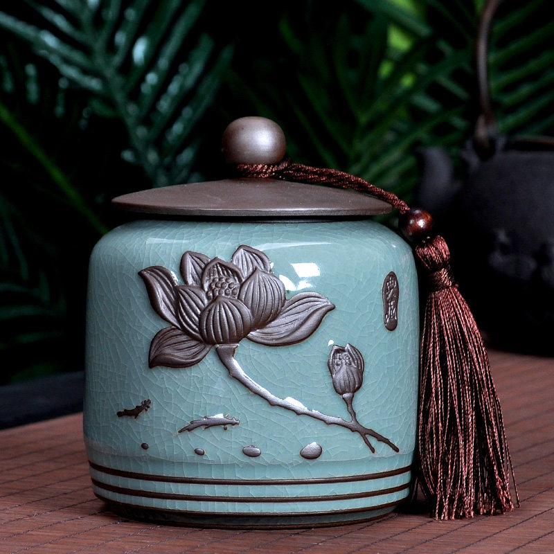 原源茶叶罐陶瓷复古浮雕紫砂密封罐中号醒茶罐西湖龙井绿茶储茶罐