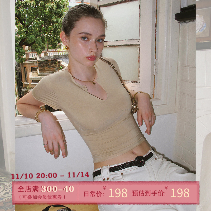 ITSNIKAR 性感v领修身显瘦短袖T恤女夏季慵懒感弹力收腰针织上衣