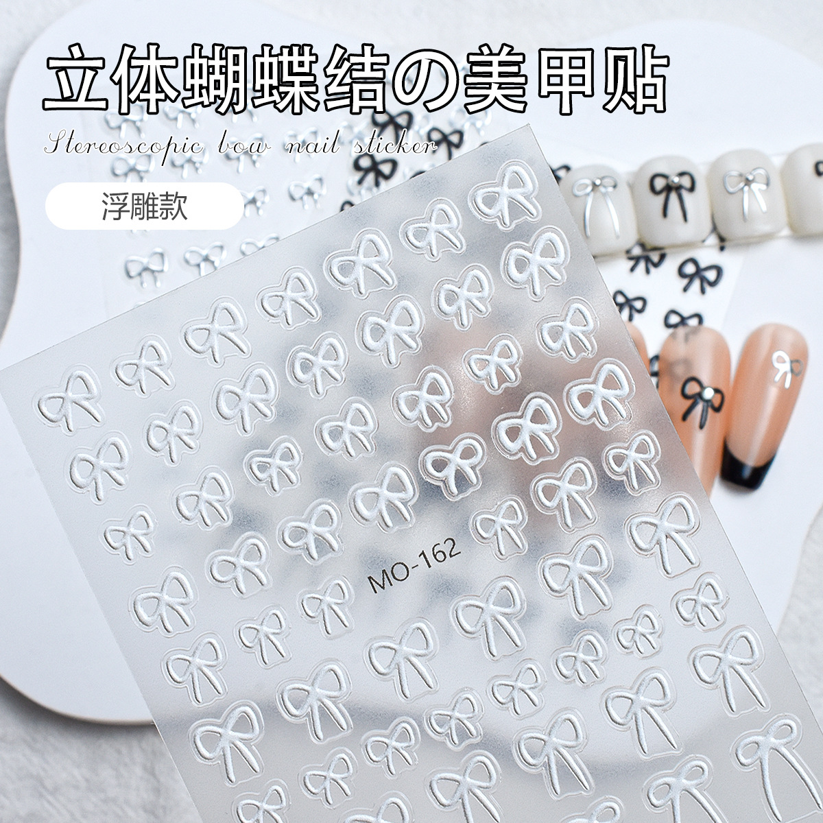 日系简约蝴蝶结美甲贴纸黑白银浮雕立体飘带蝴蝶结指甲贴花装饰品