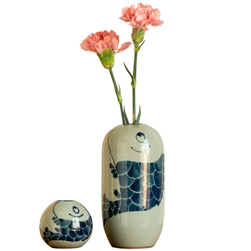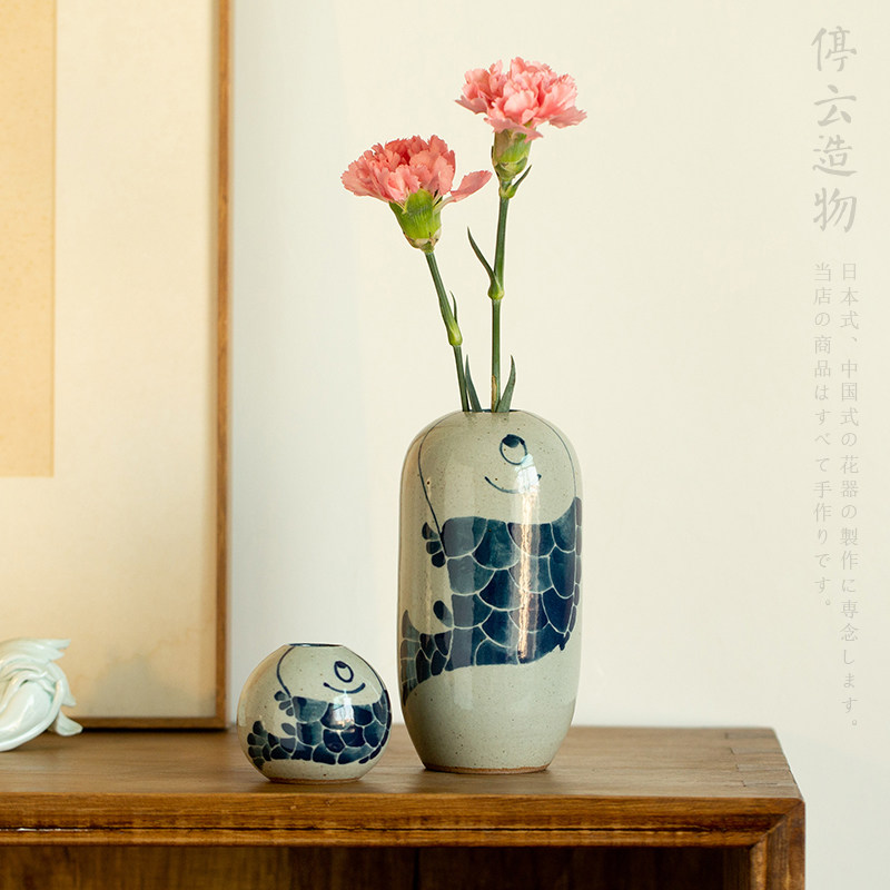 景德镇手绘青花瓷小花瓶复古创意花器中式客厅鱼摆件茶桌插花古风