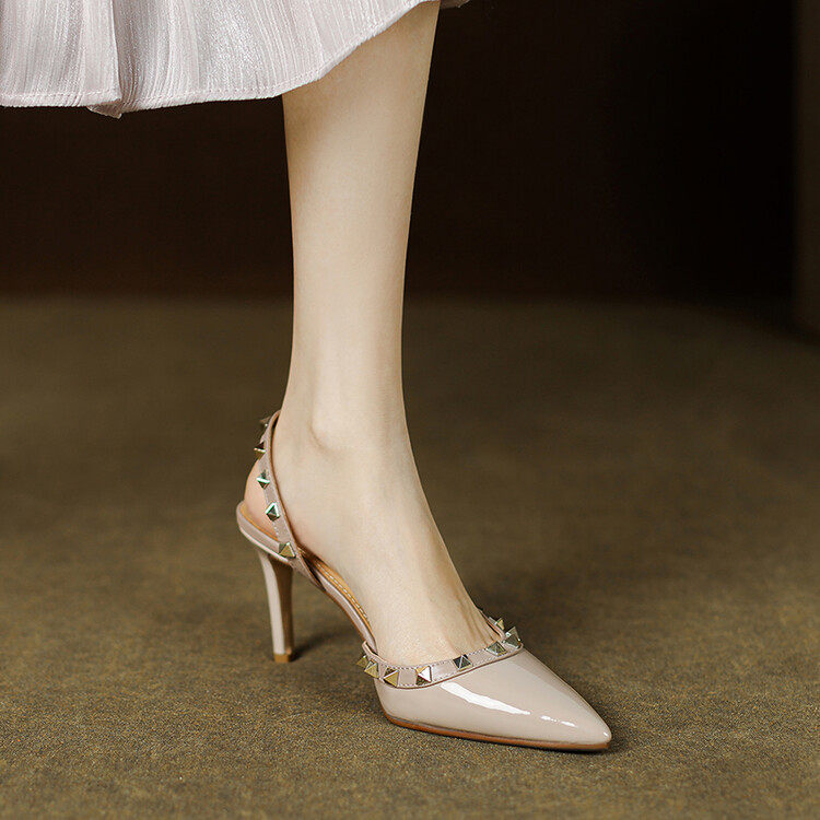 铆钉尖头高跟鞋女2023春夏新款细跟包头凉鞋后空一字扣单鞋4-17s