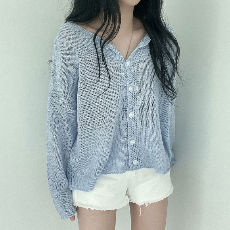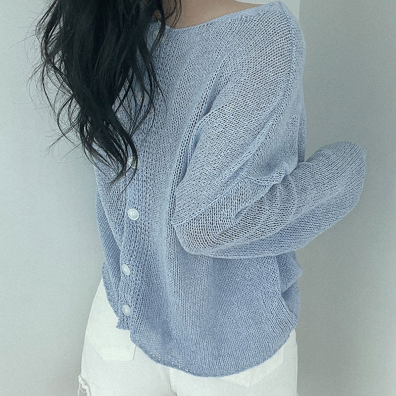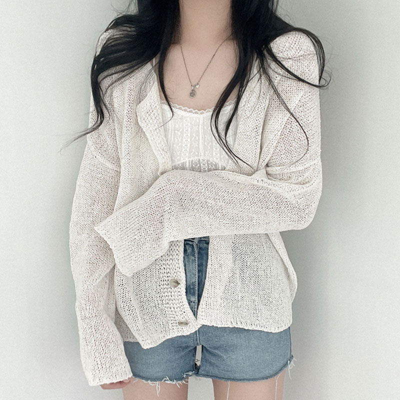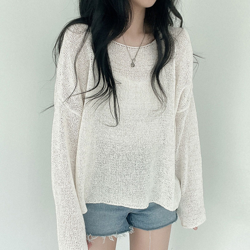 韩国chic夏季温柔简约圆领正反两穿镂空设计长袖防晒针织开衫上衣