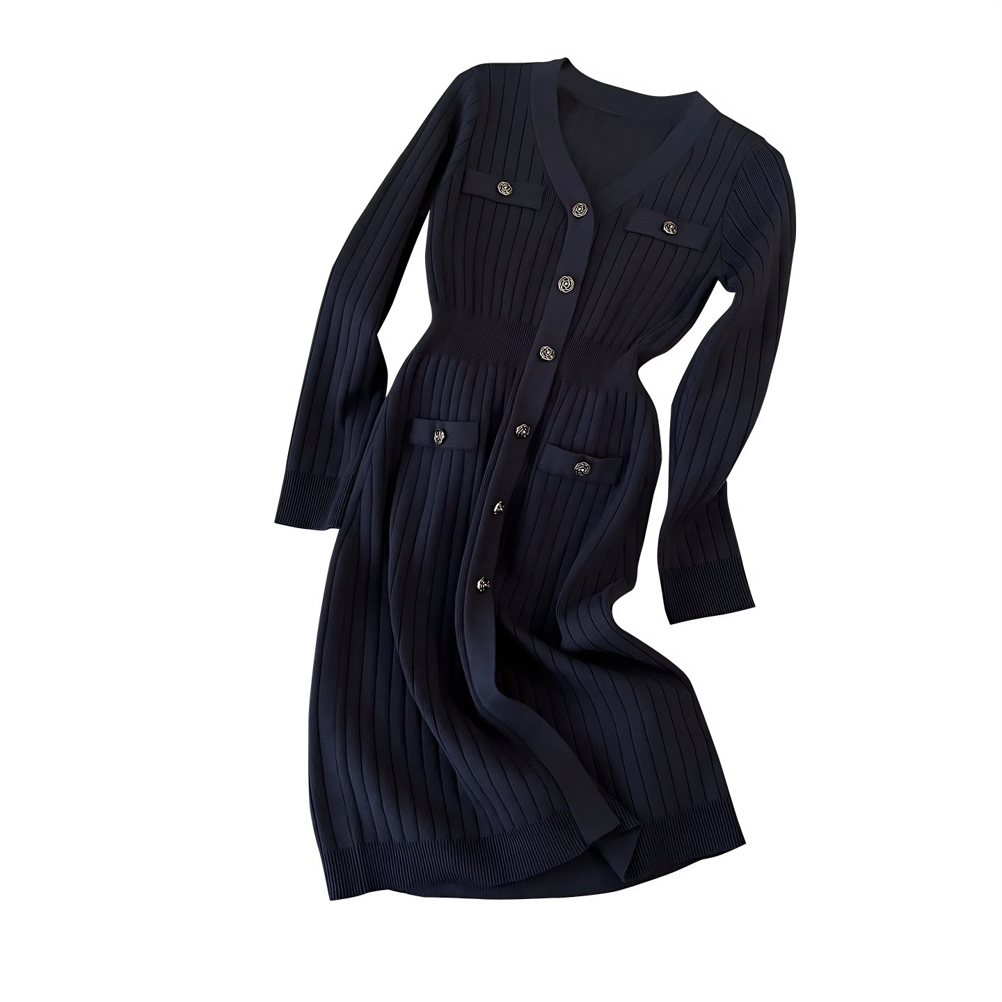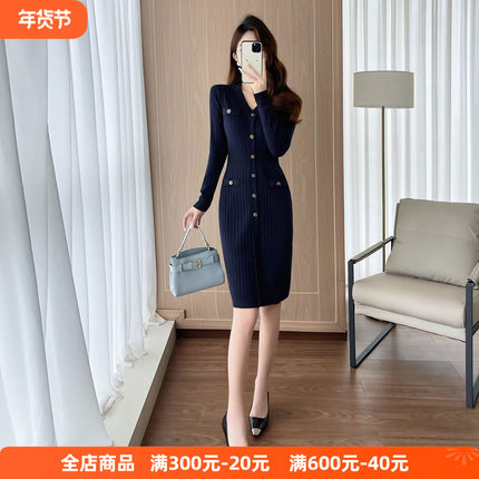 韩版气质小香风V领修身针织连衣裙跨境女装宝蓝色收腰显瘦毛衣裙