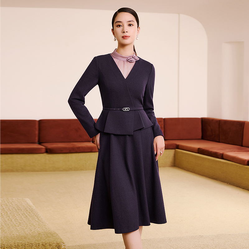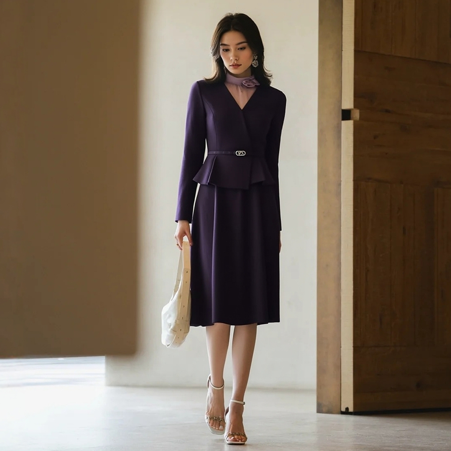 赢智尚紫色长袖秋冬女士连衣裙2025新款假两件轻奢小众不撞款裙子