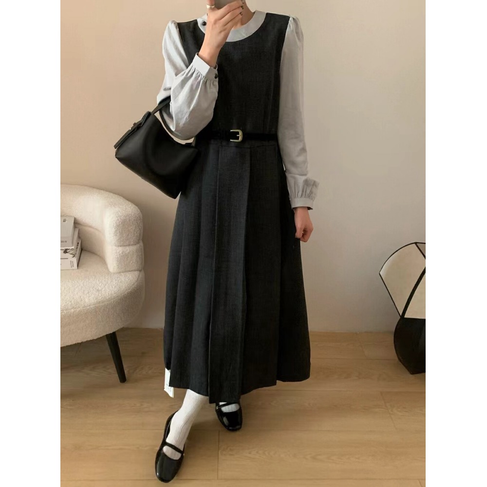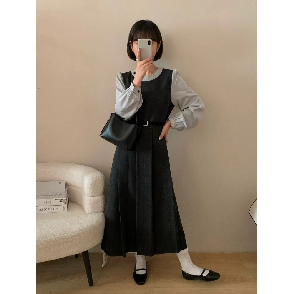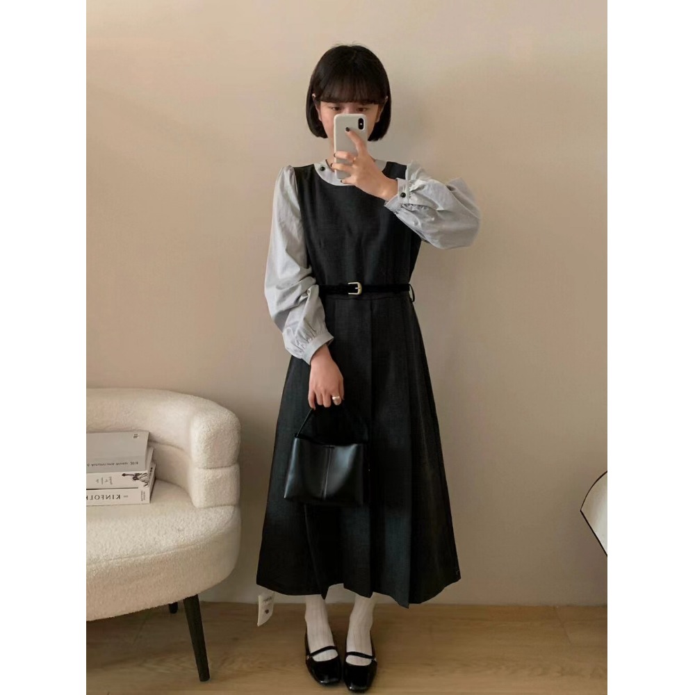 145小矮个子韩系高级感长袖假两件连衣裙150春季显瘦收腰中长裙xs