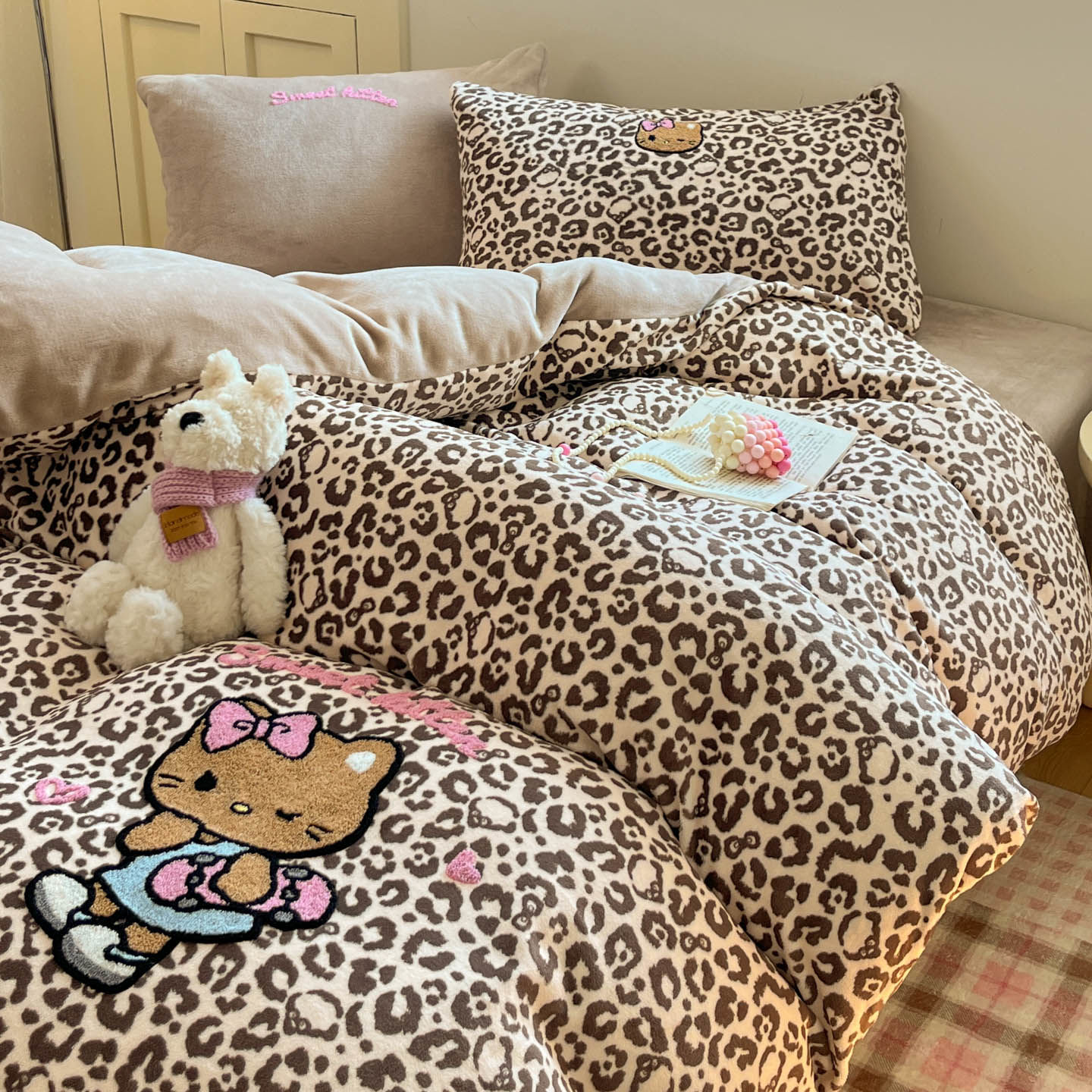 可爱黑皮猫咪卡通毛巾绣牛奶绒加厚保暖被套宿舍冬季床单三四件套