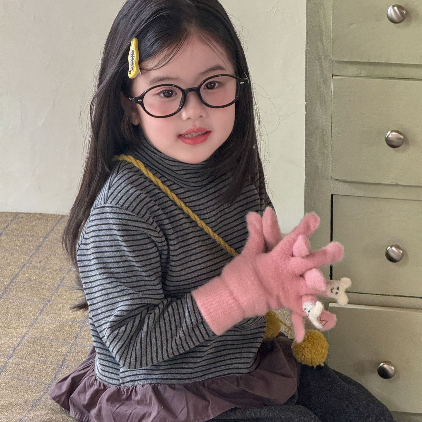 韩系冬装暖2025秋冬季新品森系条纹女童打底衫花边打底衫加绒加厚