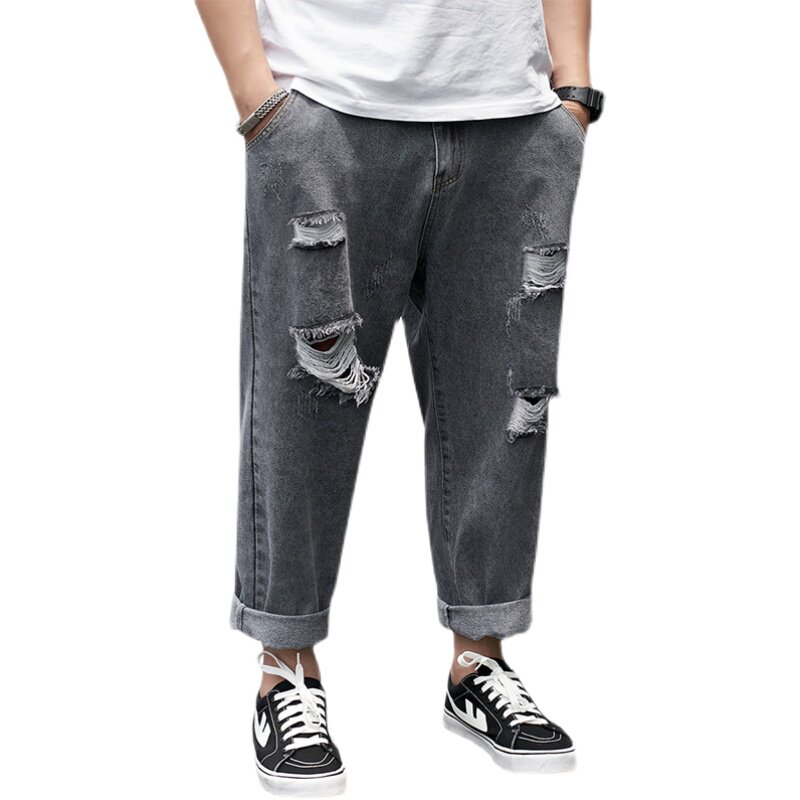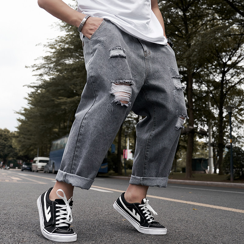 潮牌破洞九分牛仔裤男胖子阔腿9分裤加肥加大码宽松直筒老爹裤子