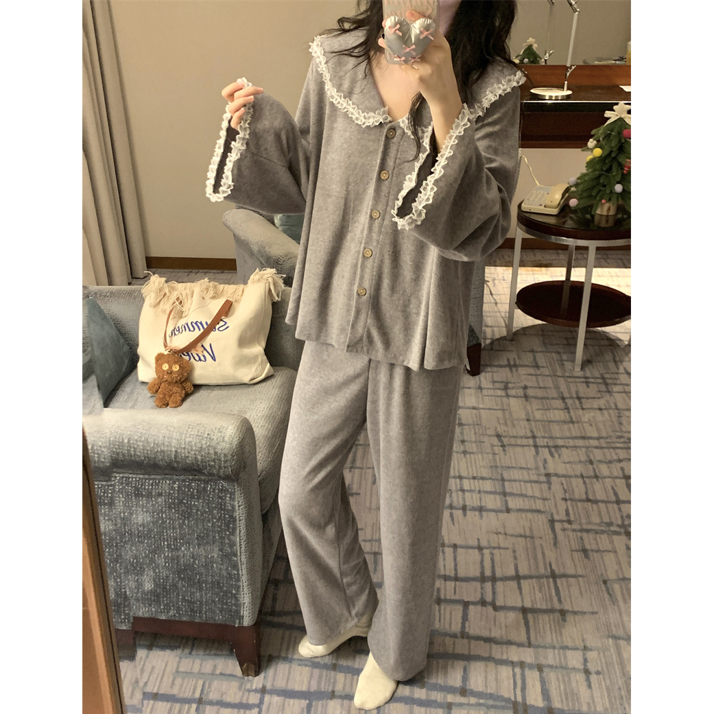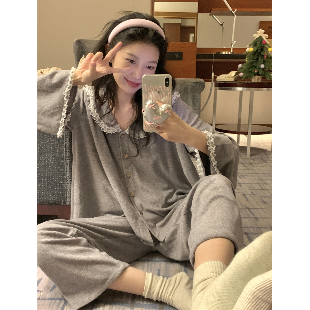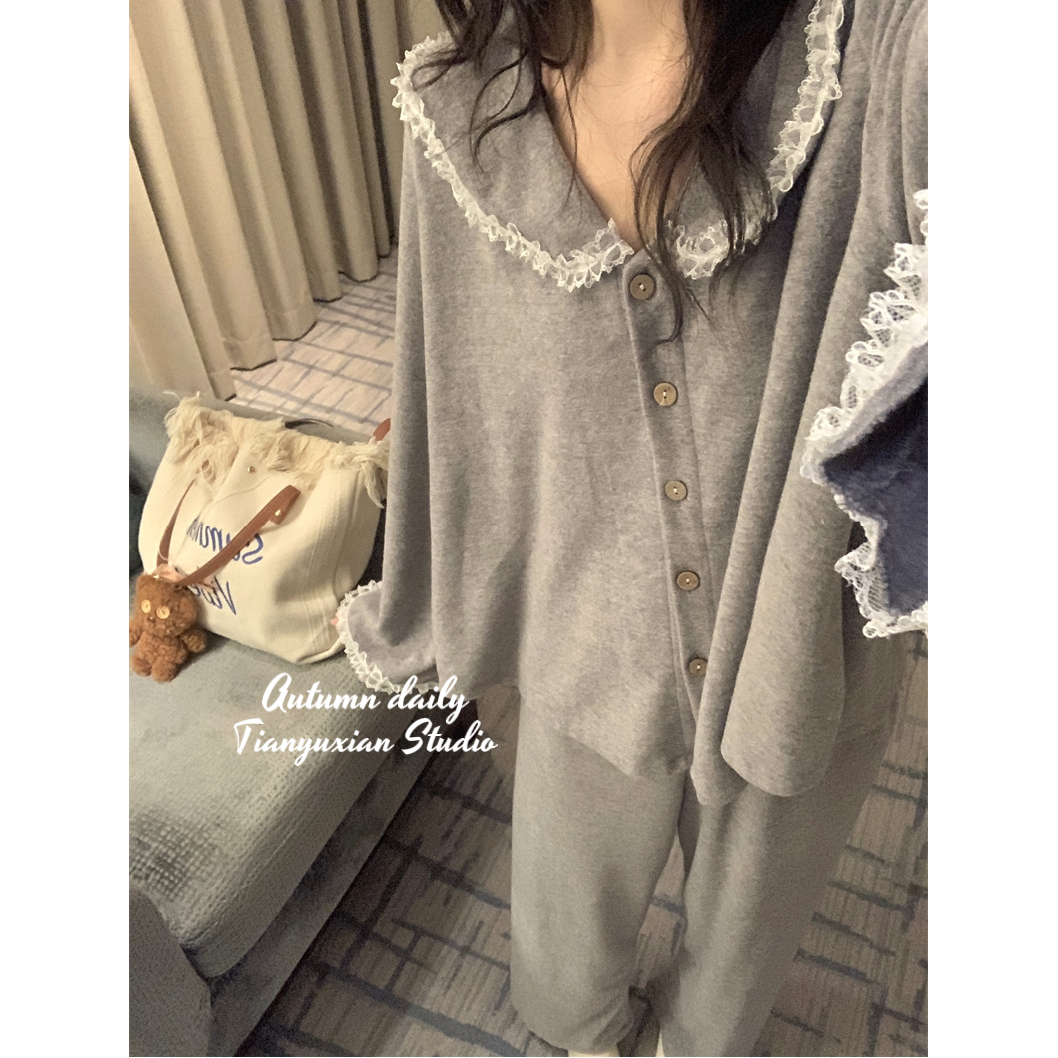 日韩系GP睡衣女款春秋季花边娃娃领长袖长裤休闲高级感家居服套装