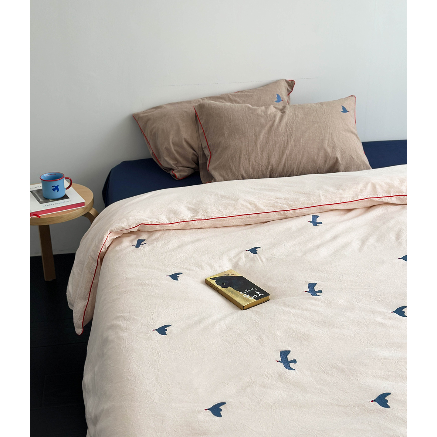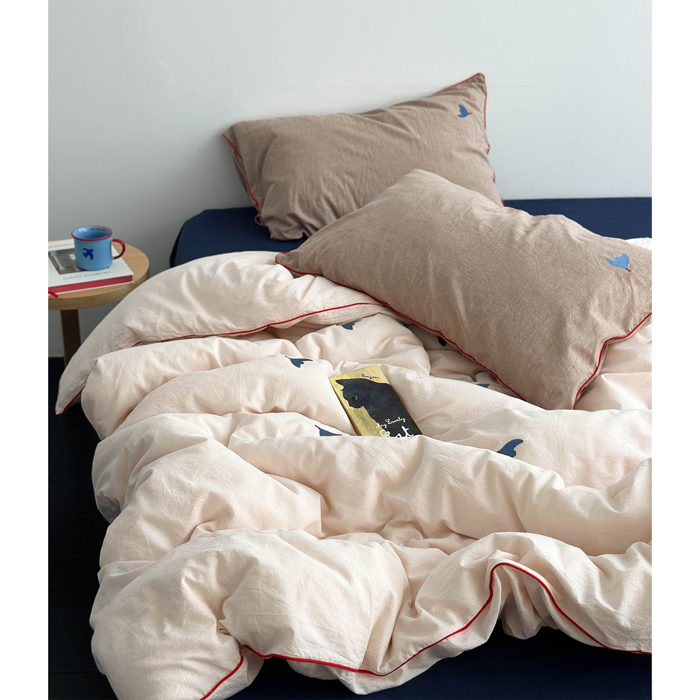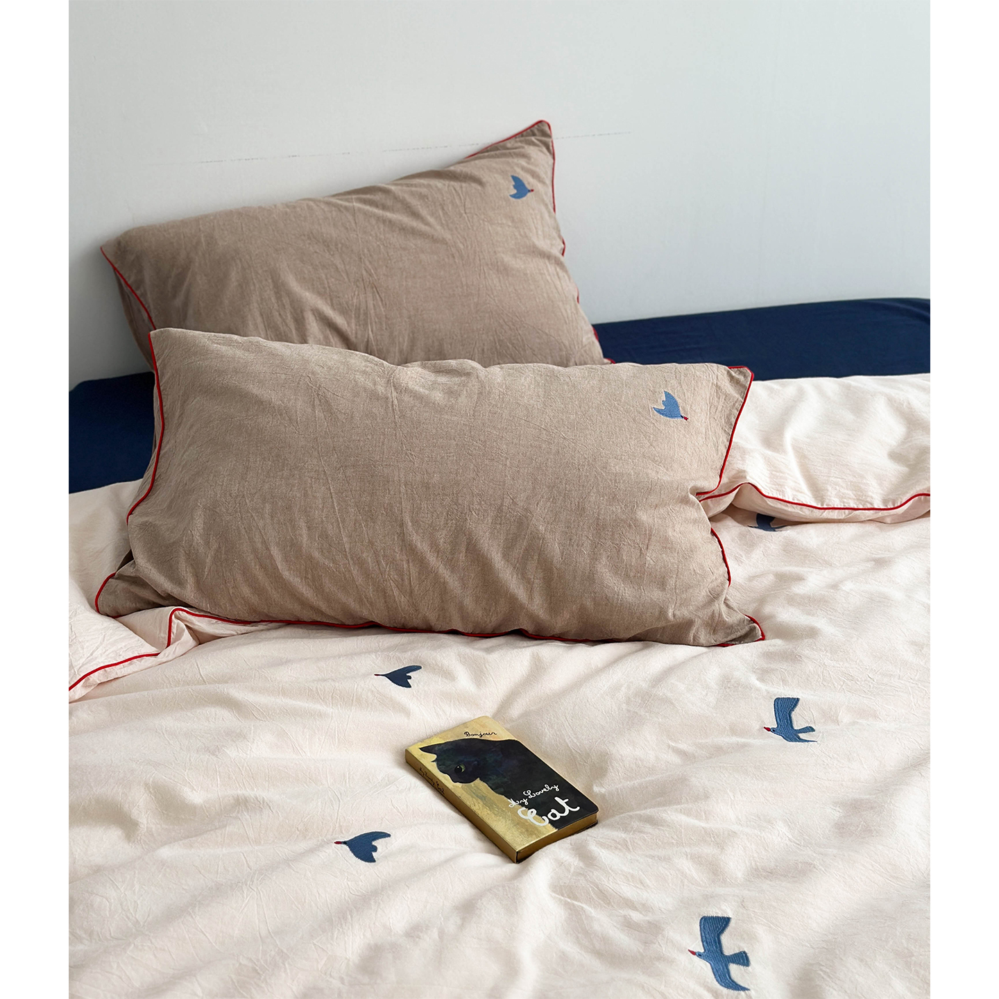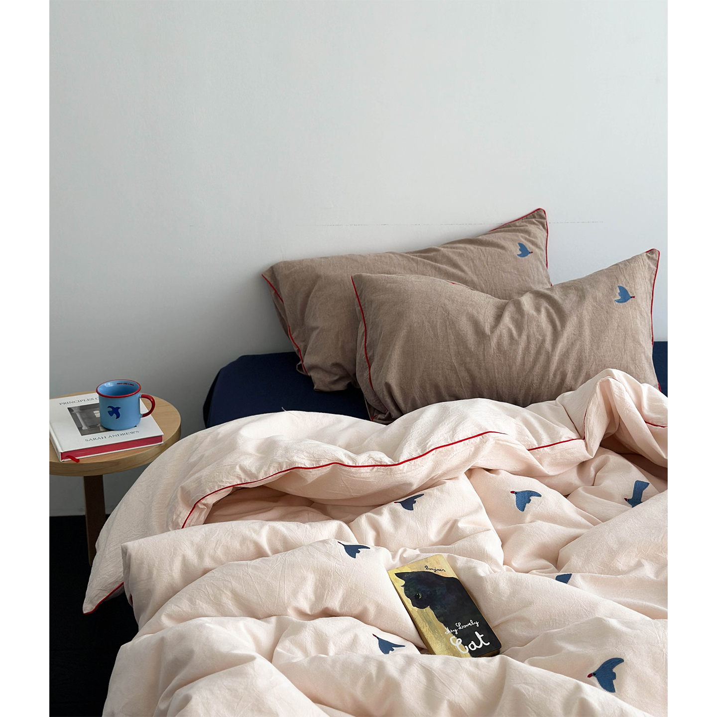 韩国ins海鸥刺绣撞色滚边全棉水洗棉被套床单 简约纯棉床上四件套
