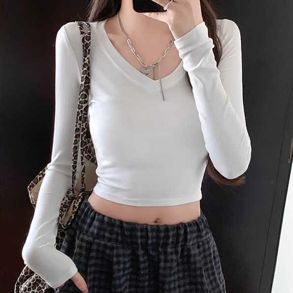 MosesQueen魔西女王V领短款长袖T恤早秋辣妹韩版修身打底上衣