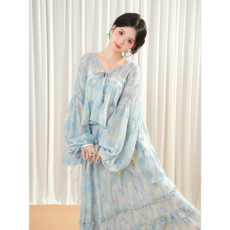 新中式印花宽松灯笼袖衬衫+半身裙套装女2025夏季新款超仙两件套