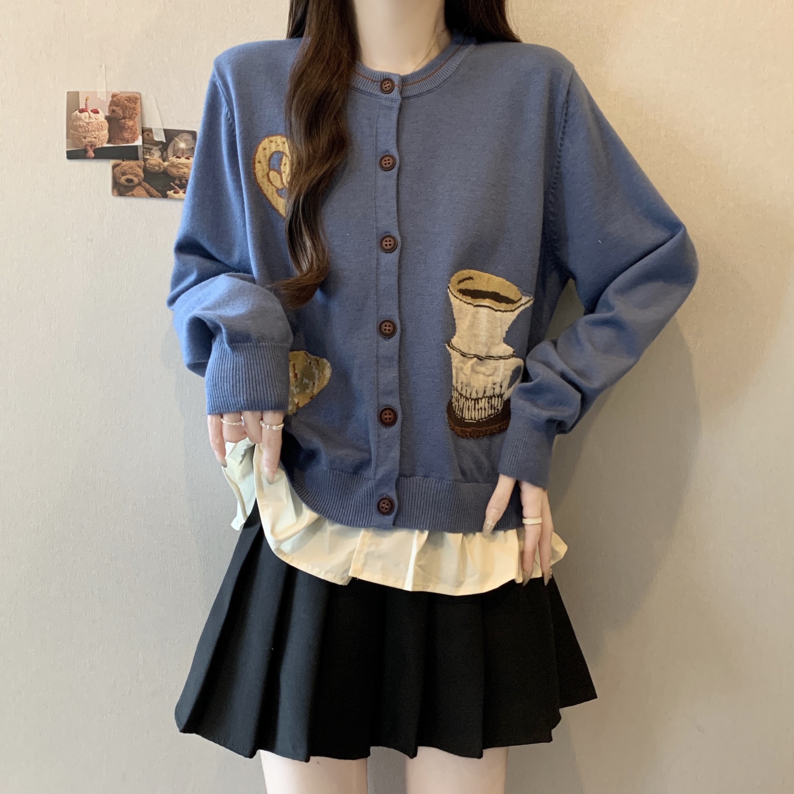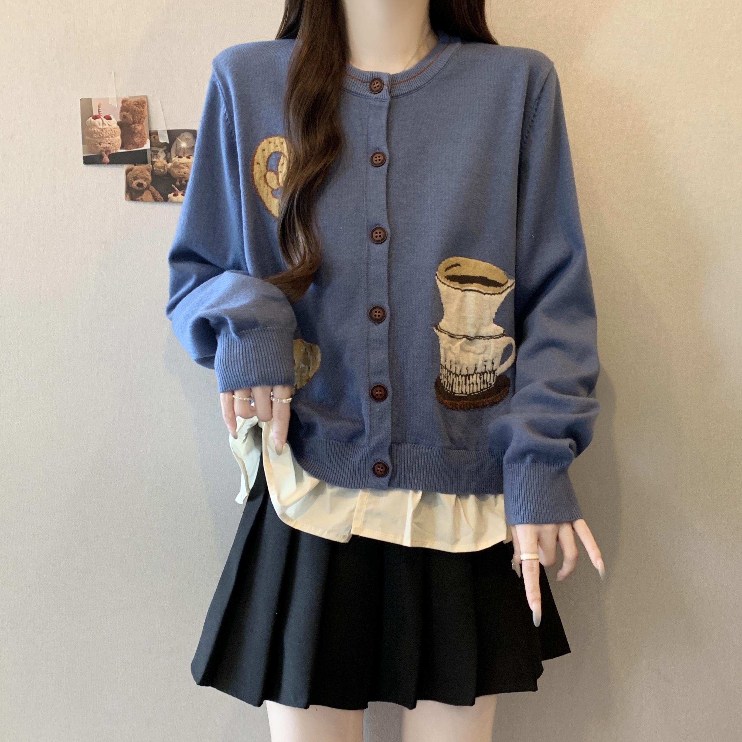 实拍~胖MM大码提花毛衣拼接衬衫假两件上衣显瘦蓝色针织衫