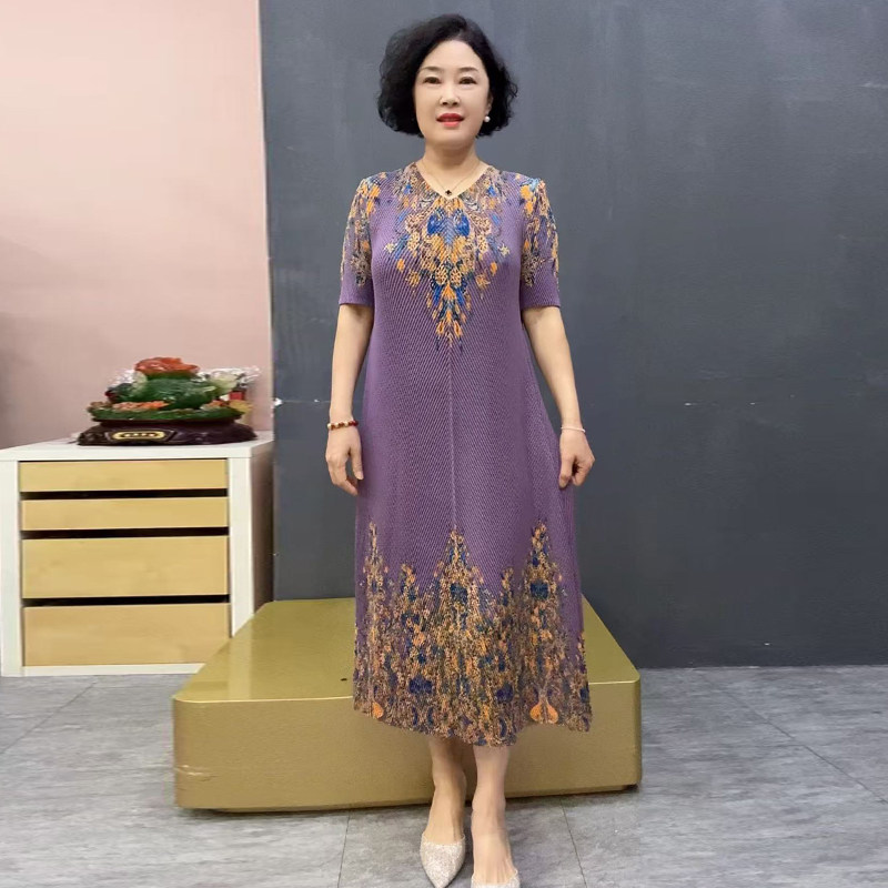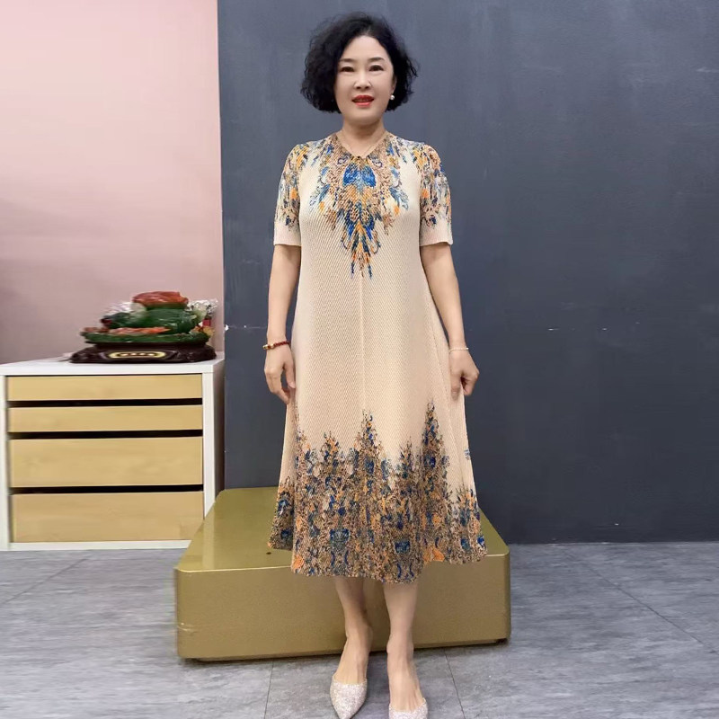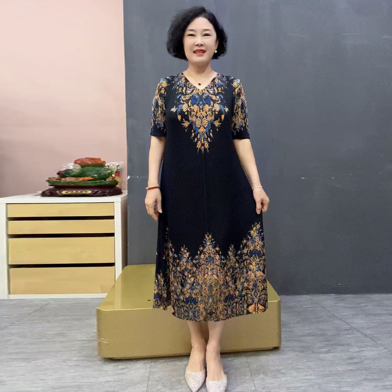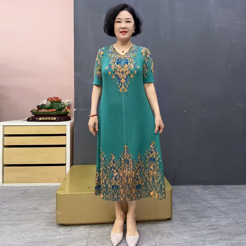 冰丝褶皱弹力连衣裙短袖宽松遮肉大码夏季短袖妈妈装洋气印花长裙