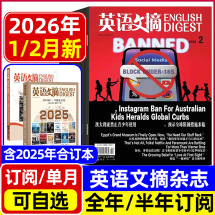 英语文摘杂志2026年1/2月新/2025年1-12月全年半年合订本 中英文双语四六级初高中高考双语版非英语世界英语街