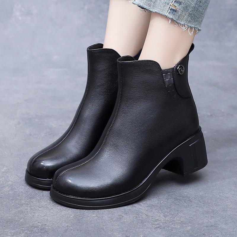真皮短靴女马丁靴粗跟春秋单靴子中跟妈妈靴冬季加绒棉鞋女士皮鞋