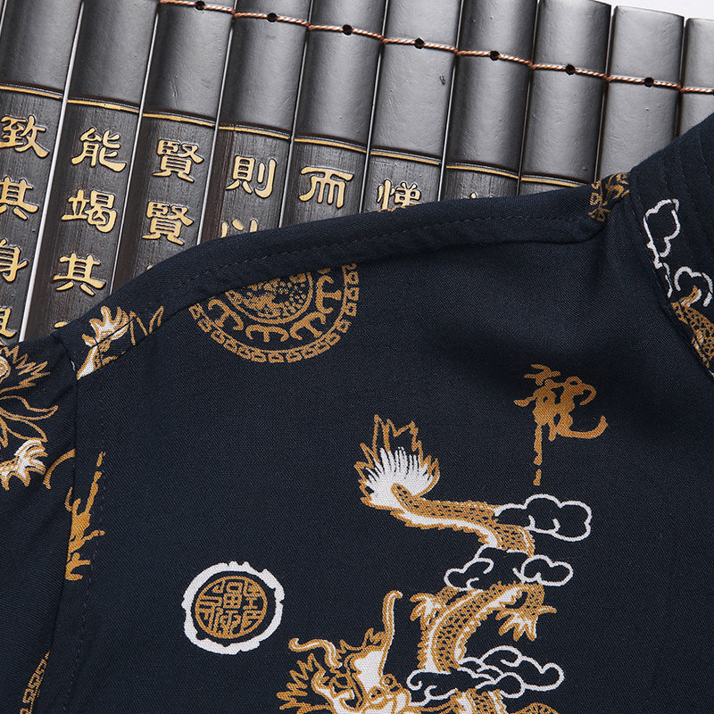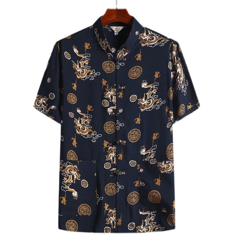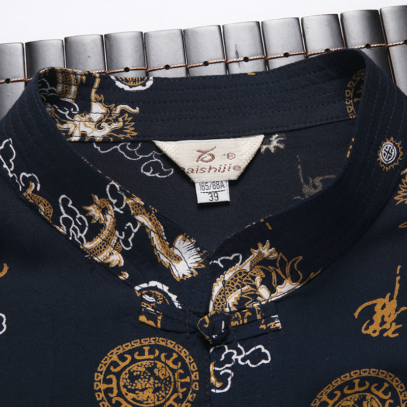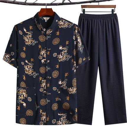 夏季中老年人男棉绸短袖衬衫套装唐装中山装大码休闲爸爸装汉服薄