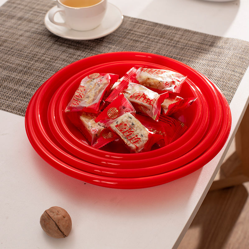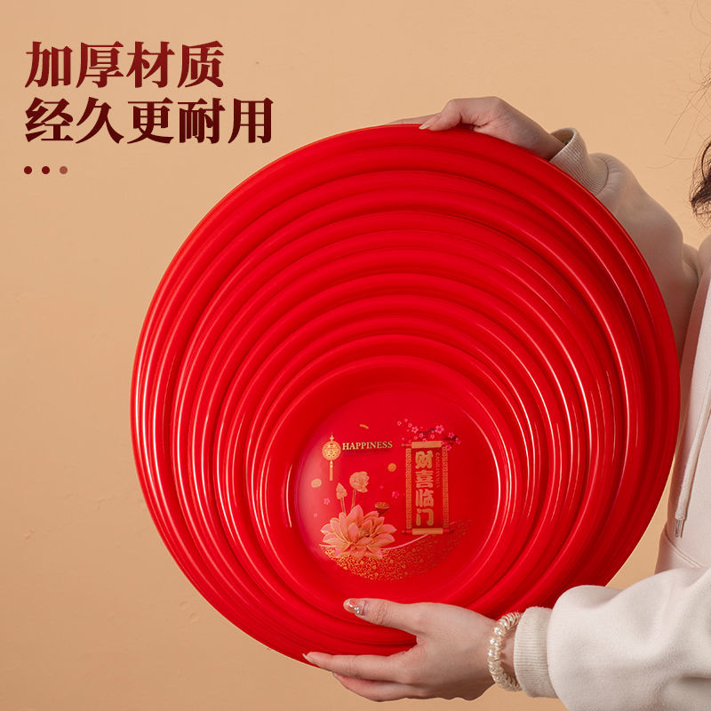 红色喜事财喜临门圆盘塑料水果盘供盘结婚婚庆糖果盘拜神老爷盘