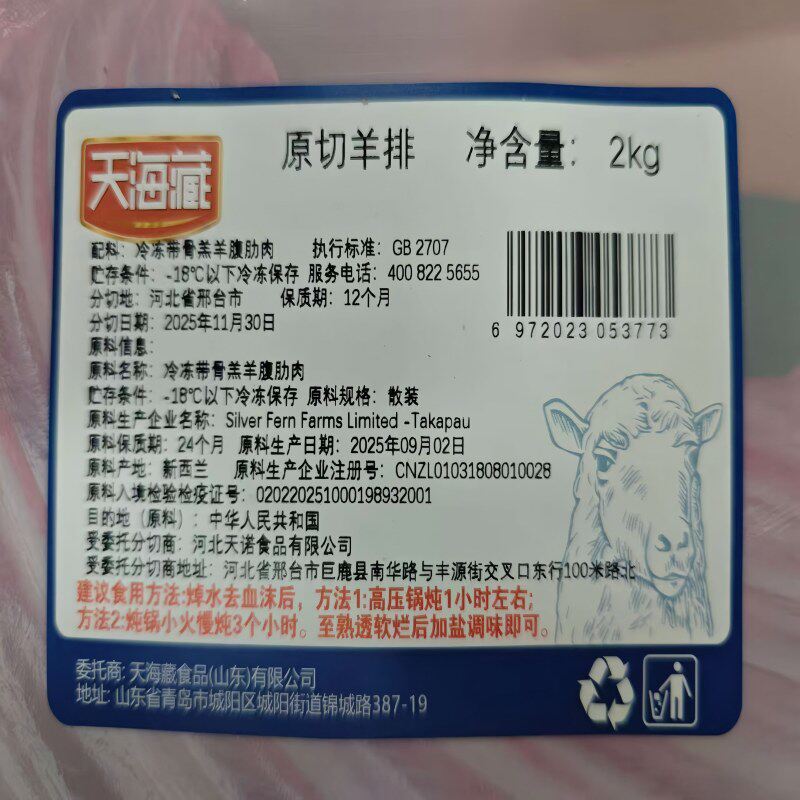 天海藏原切羊排2kg手把羊肉煎烤红烧鲜嫩 新西兰/澳洲等地进口