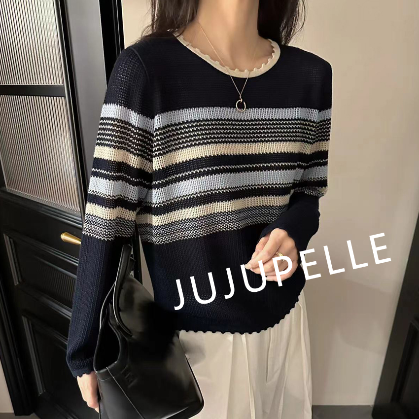 圆领复古撞色条纹韩系2025秋季新款针织打底衫长袖百搭女宽松毛衣