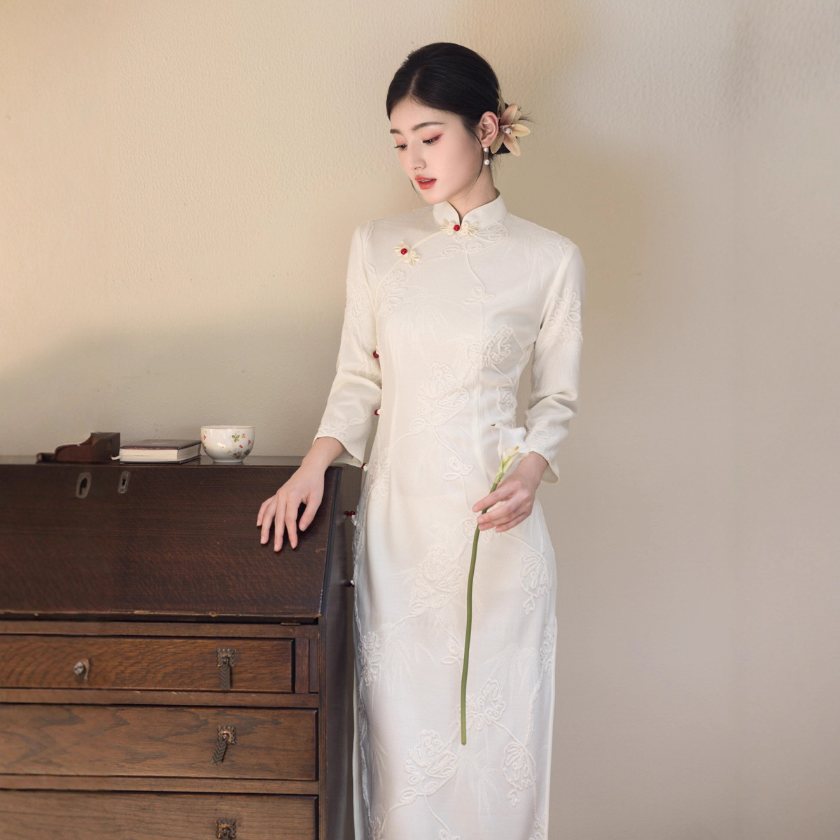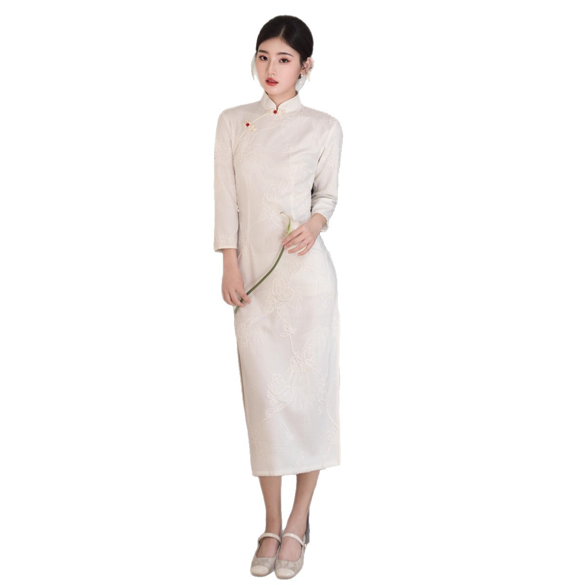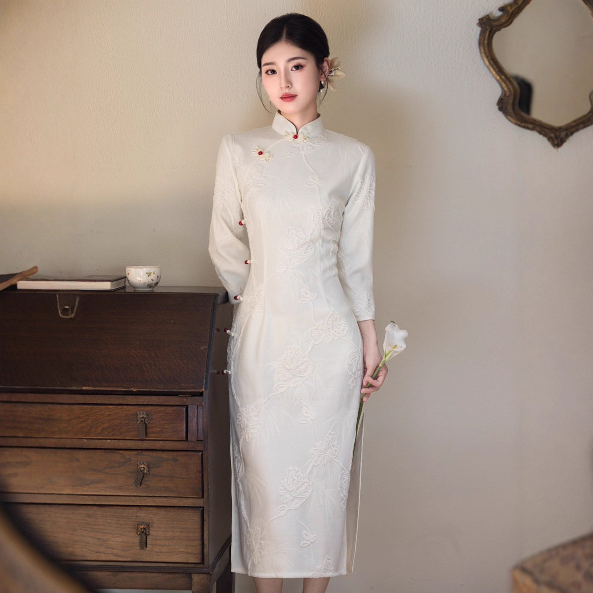 白色旗袍秋款2025年新款复古改良版长袖年轻款旗袍连衣裙秋冬