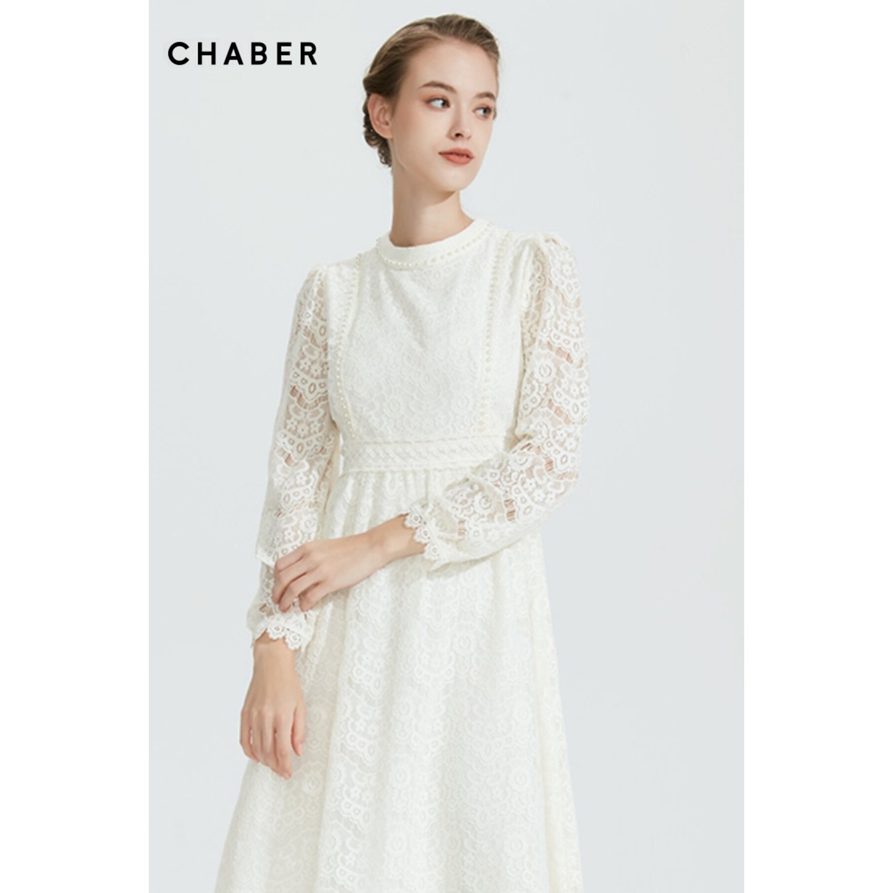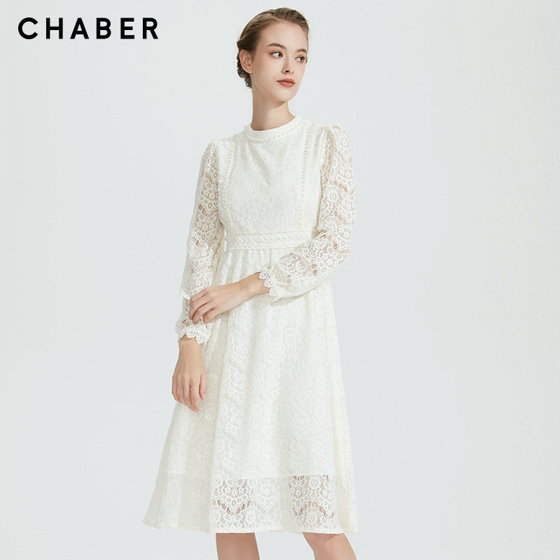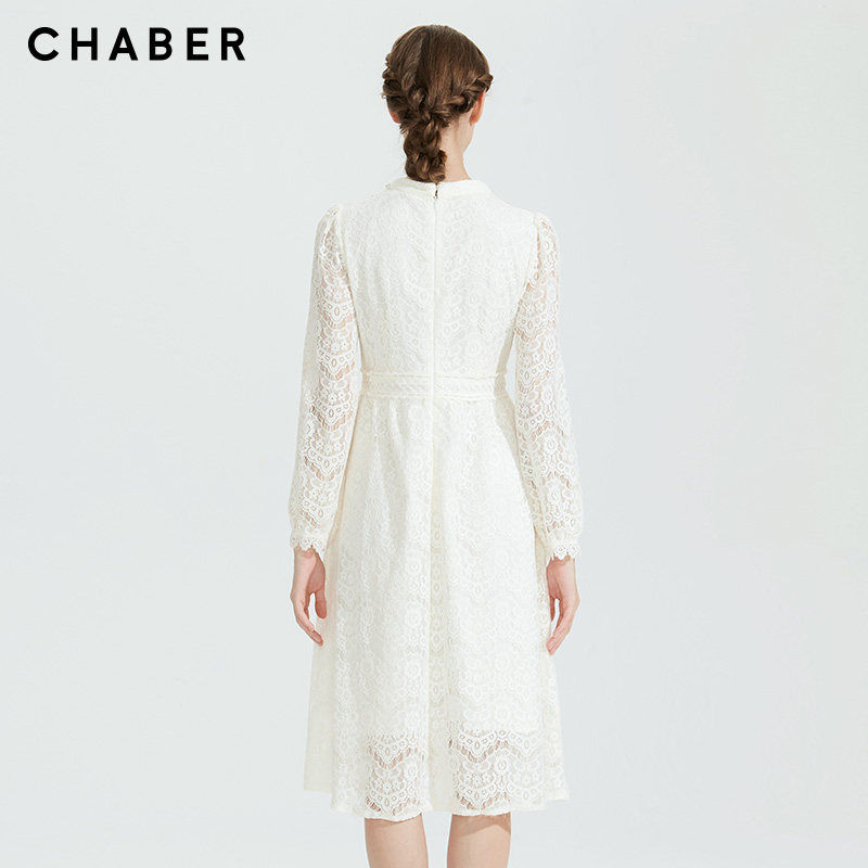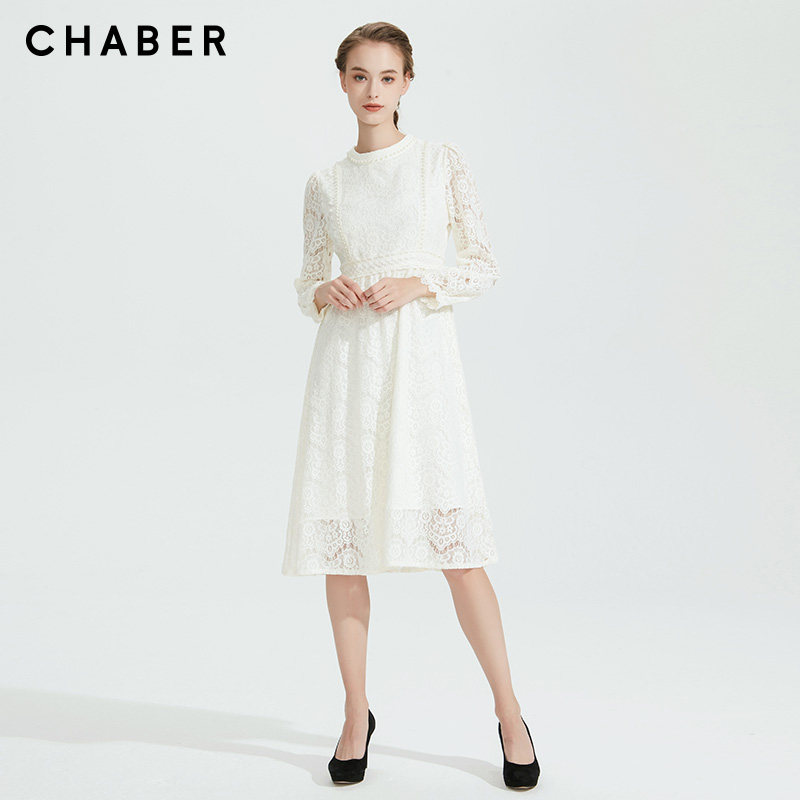 chaber/巧帛秋新款简约优雅圆领长袖中长款连衣裙824736