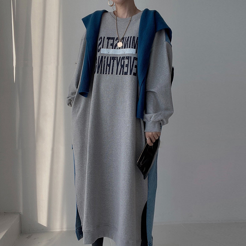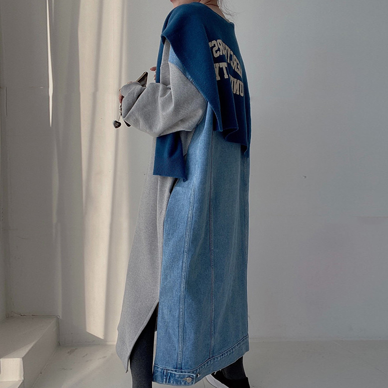 韩国chic春秋小众简约圆领字母印花拼接牛仔设计长袖卫衣连衣裙女
