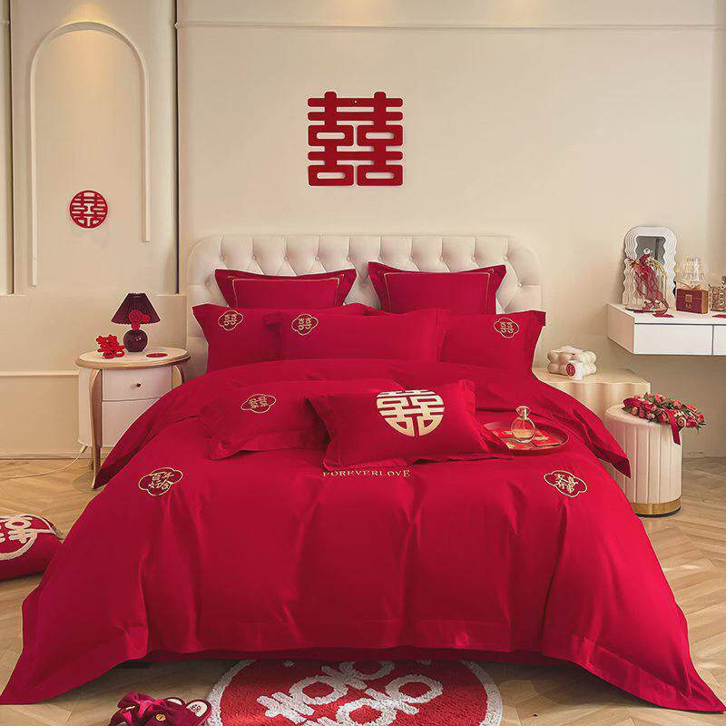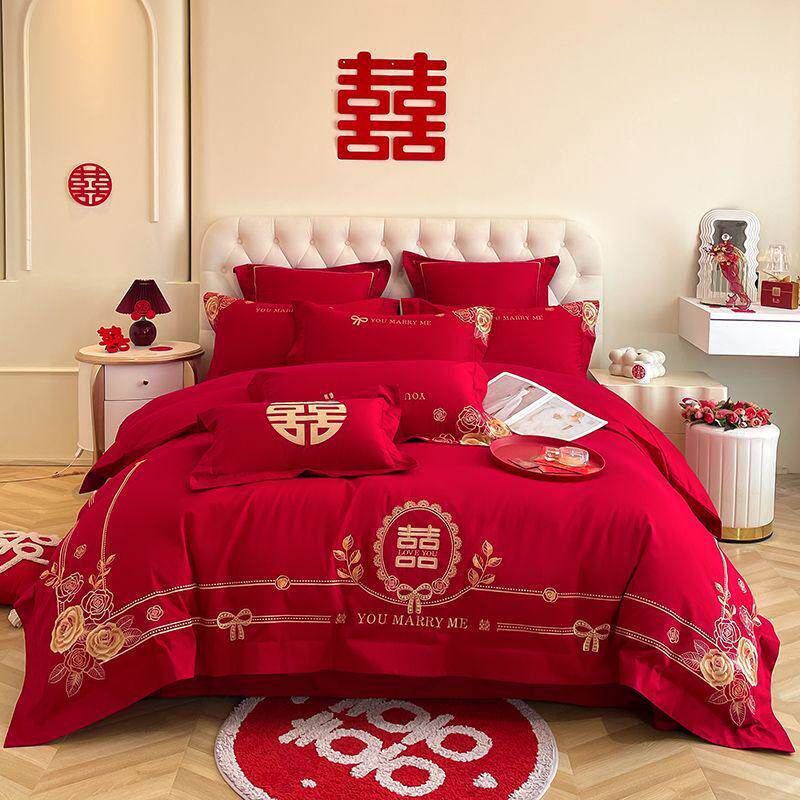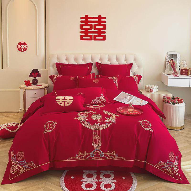 高档结婚中式刺绣大红色床上用品四件套龙凤新婚陪嫁婚庆床单被套