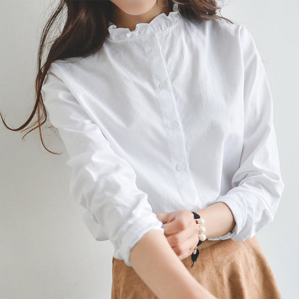 春秋纯棉白色花边领女衬衫木耳领文艺小清新长袖学生韩范打底衫潮