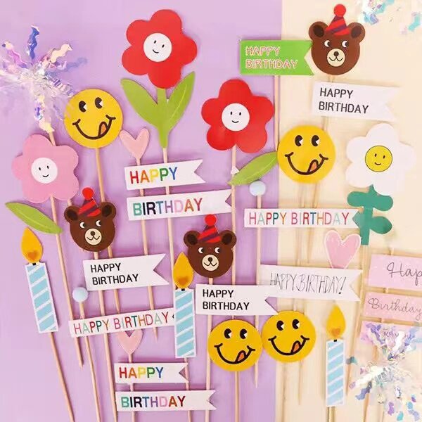 韩国风彩旗蛋糕装饰插件HBD笑脸太阳花朵小熊横幅爱心插牌插卡