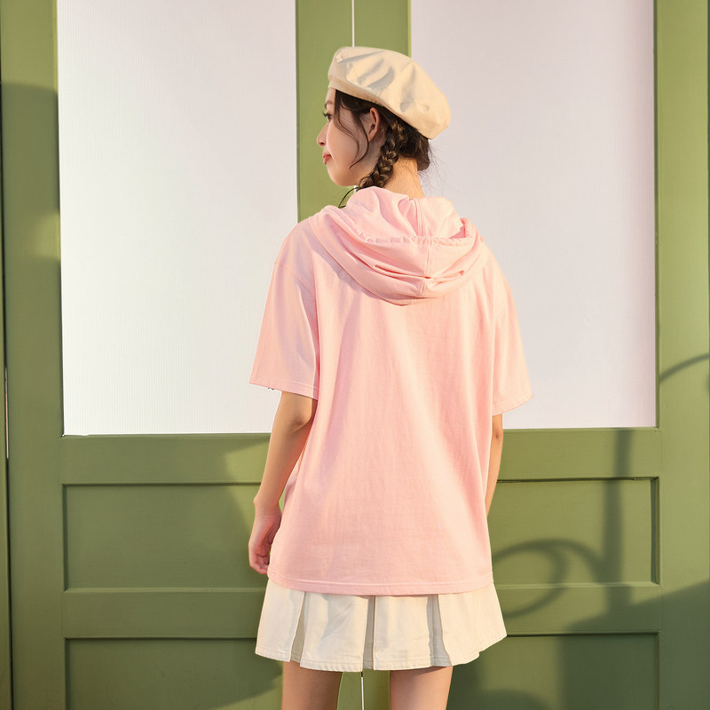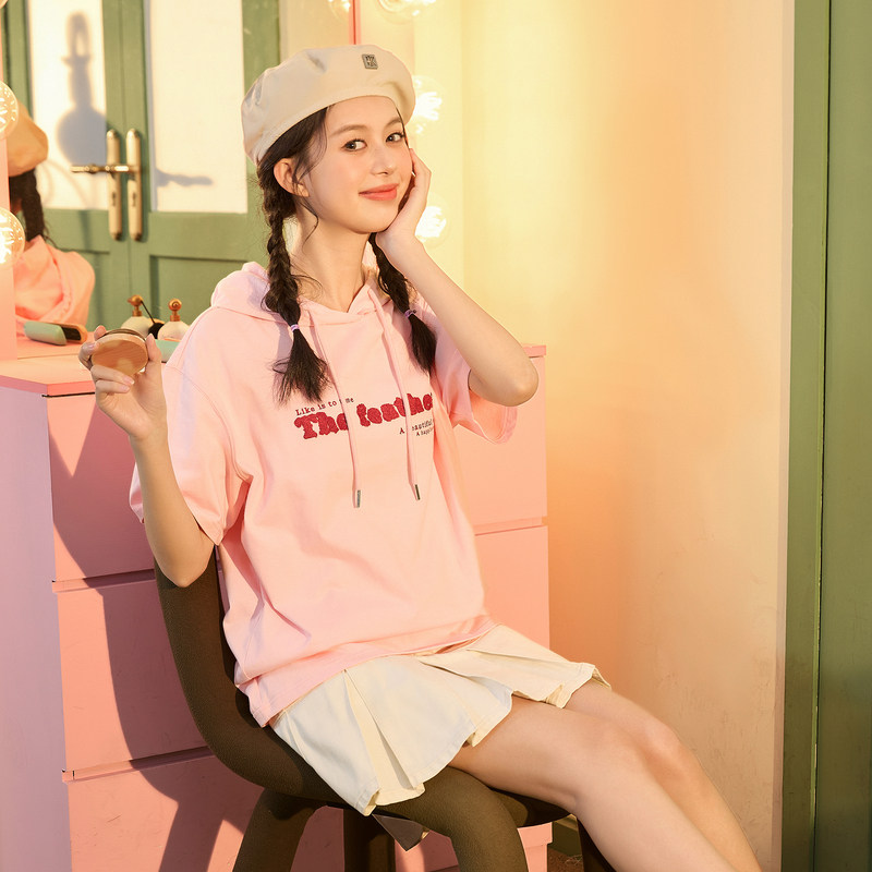 唐狮夏季新款女T恤粉色连帽宽松短袖卫衣百搭休闲纯棉上衣