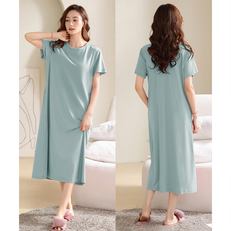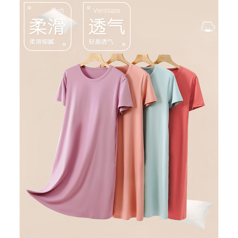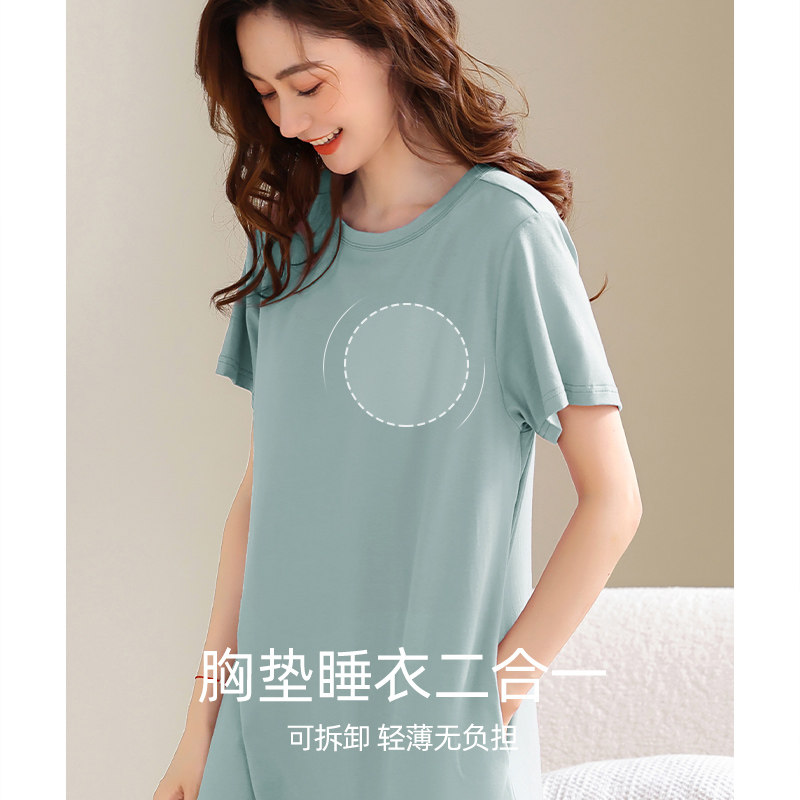 带胸垫睡裙女士夏季莫代尔短袖长款睡衣裙薄款冰丝孕妇夏款连衣裙