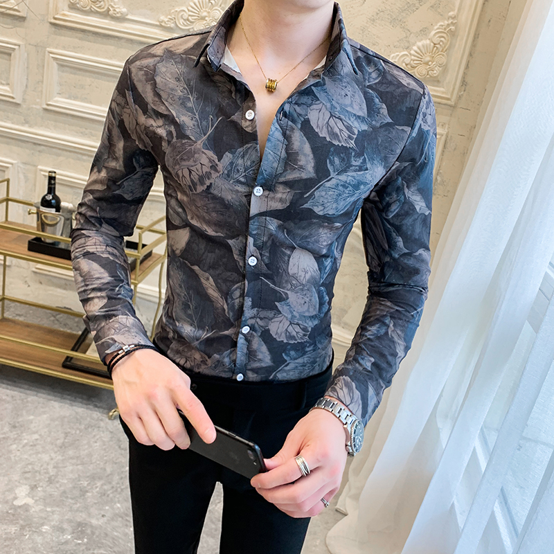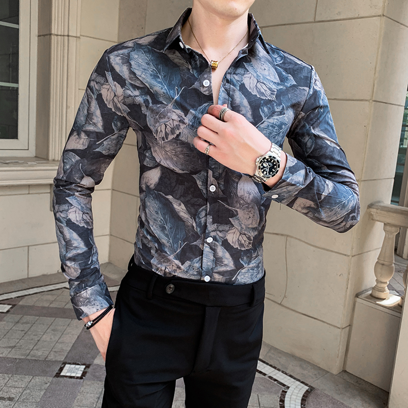 春秋装高级感衬衫男长袖痞帅花上衣发型师高端潮牌修身韩版衬衣服