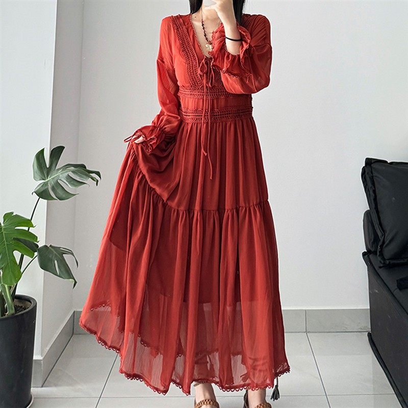 橱大爆炸波西米亚红色深绑带连衣裙蕾丝花边长裙长袖旅游茶歇裙