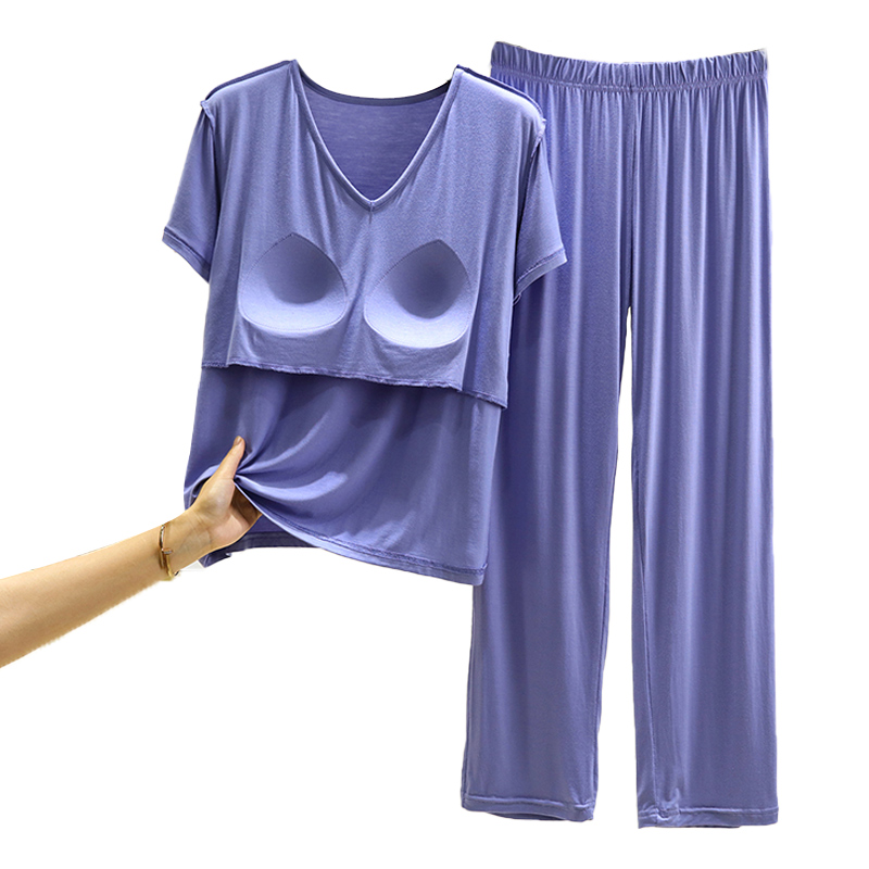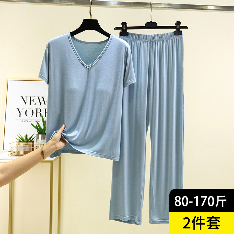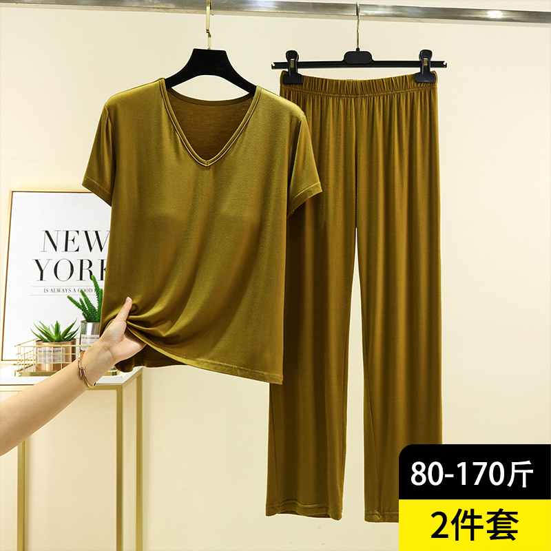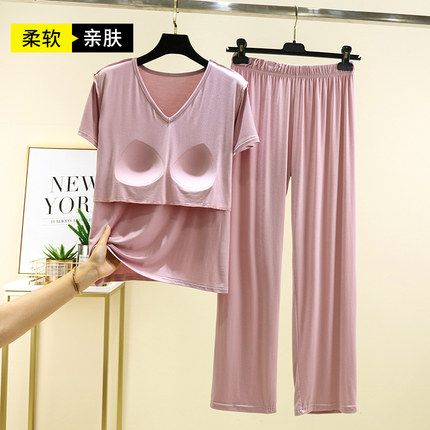 外穿莫代尔带胸垫短袖长裤套装女夏薄款家居服宽松大码睡衣两件套