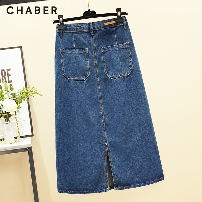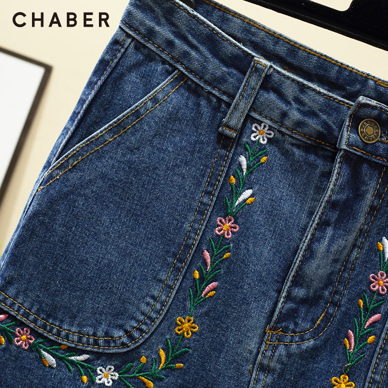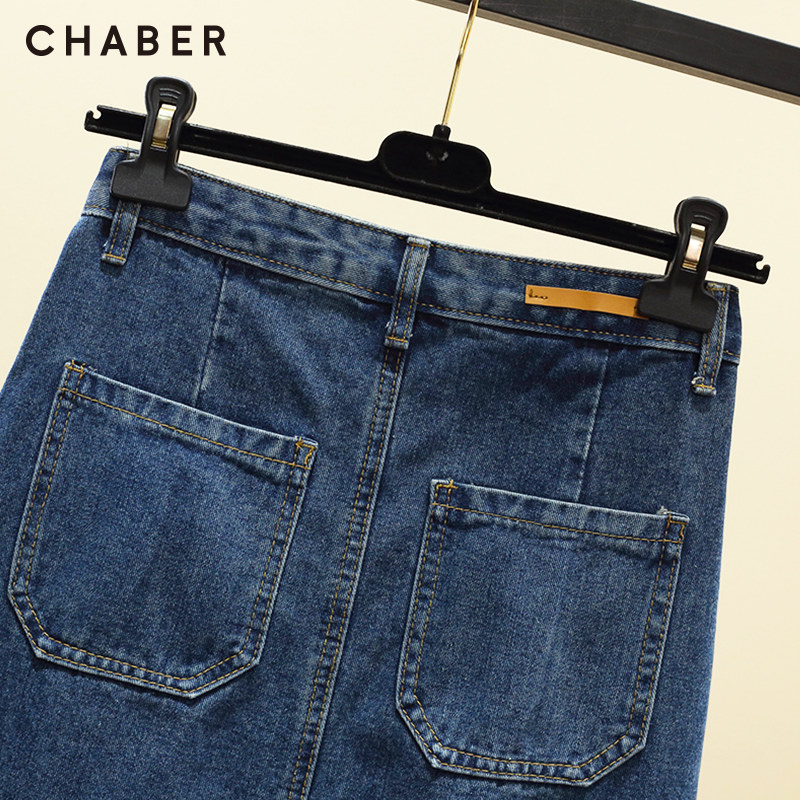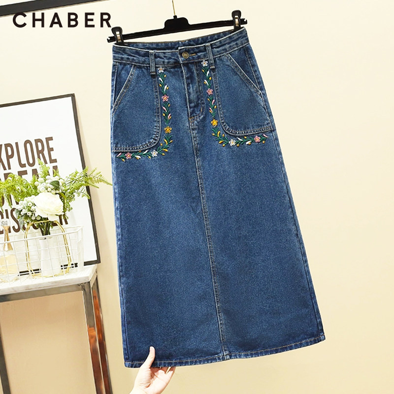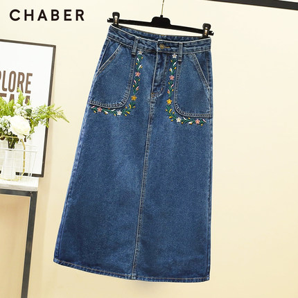 chaber巧帛秋季新品开叉牛仔纯色刺绣中长款高腰显瘦A字半身裙