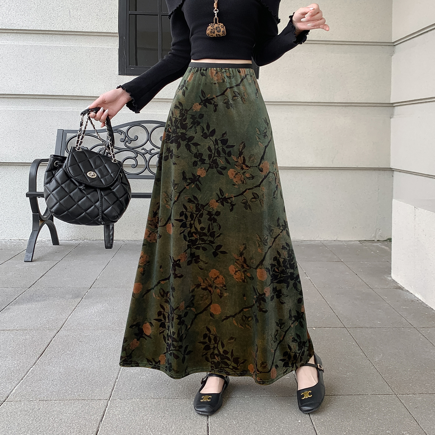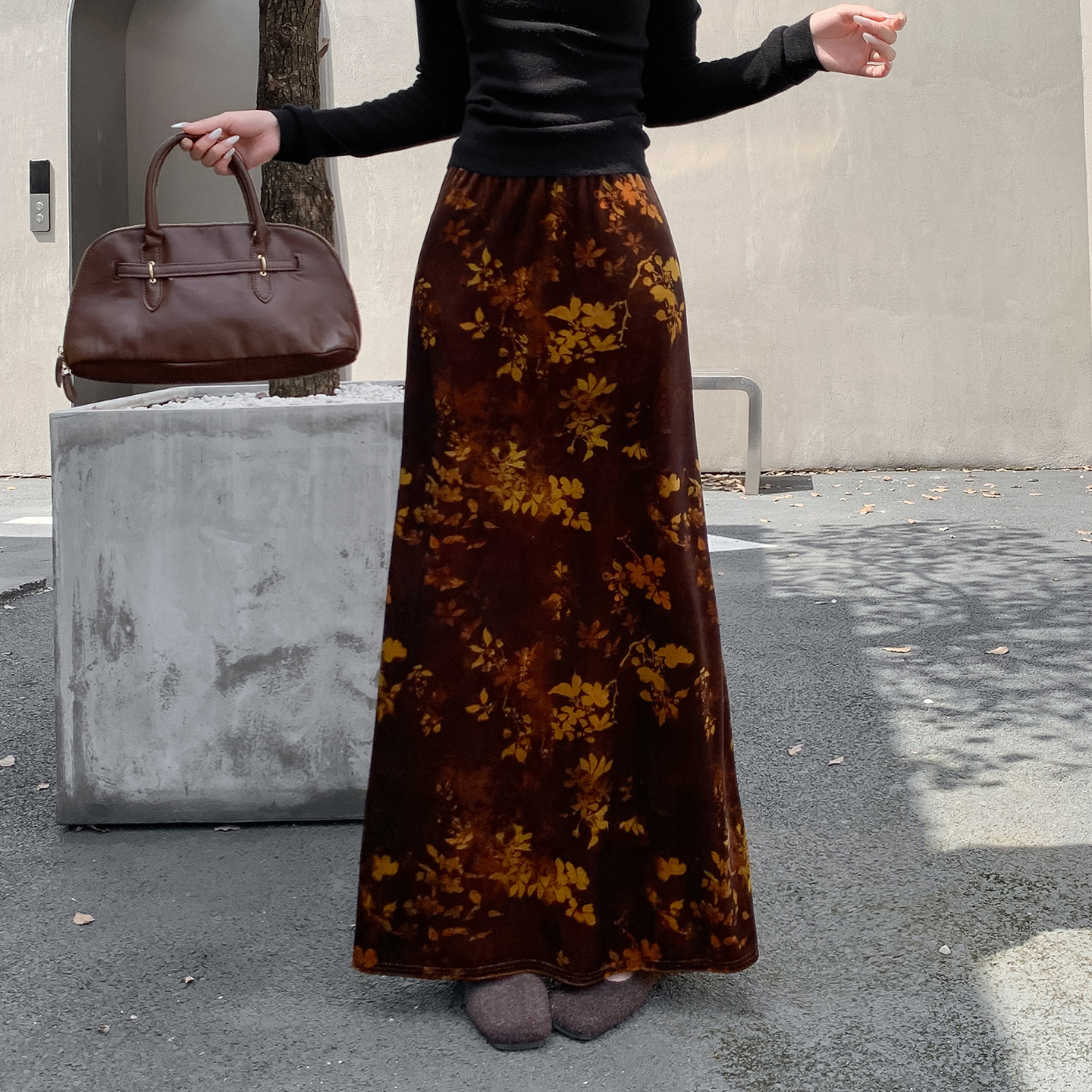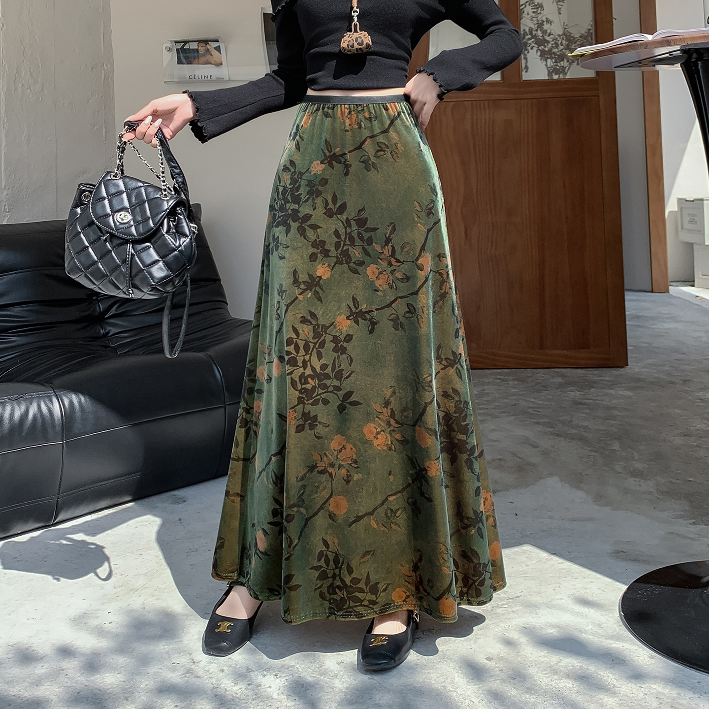 新中式丝绒印花半身裙女2025秋冬高腰显瘦气质a字包臀鱼尾裙长裙