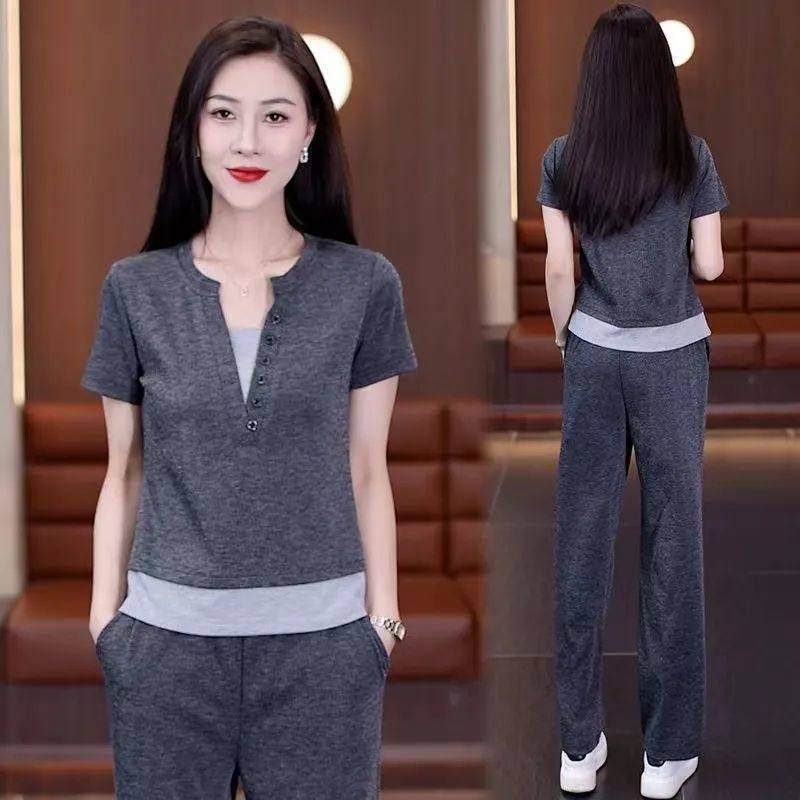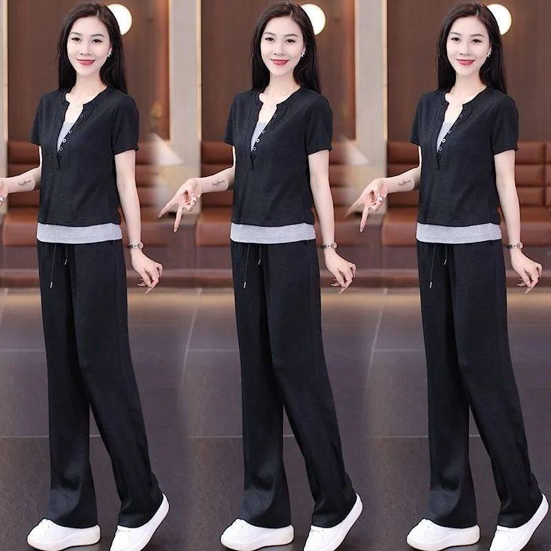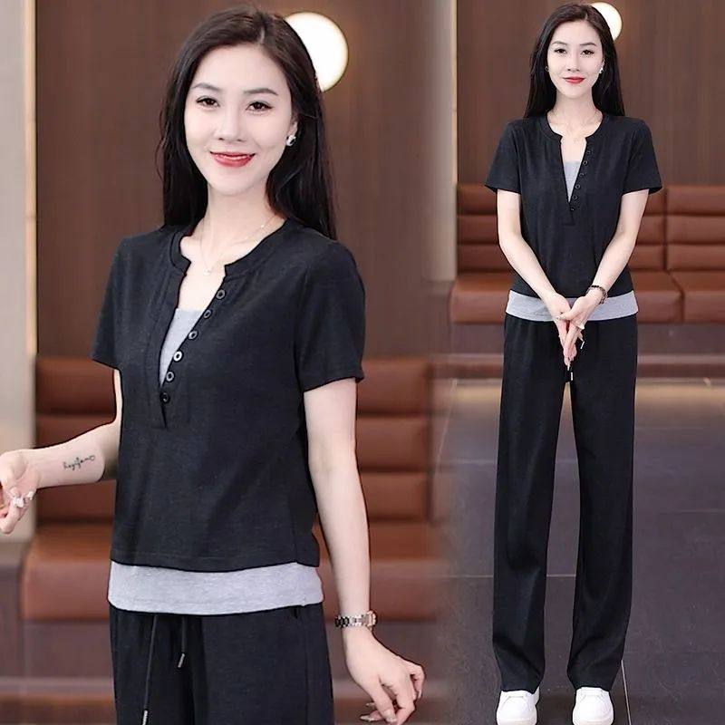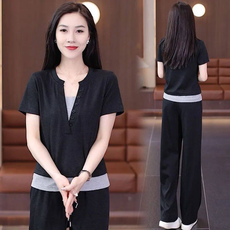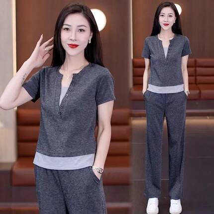 时尚减龄拼接上衣夏季新款纯色短袖假两件百搭阔腿裤休闲两件套装