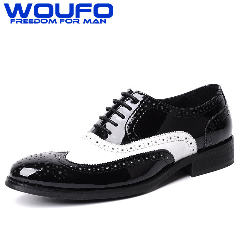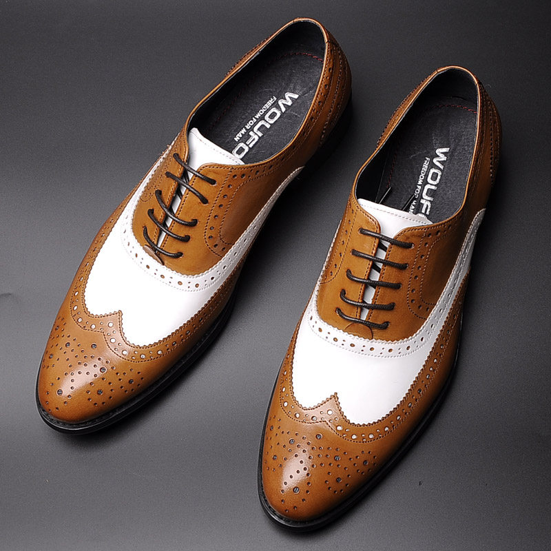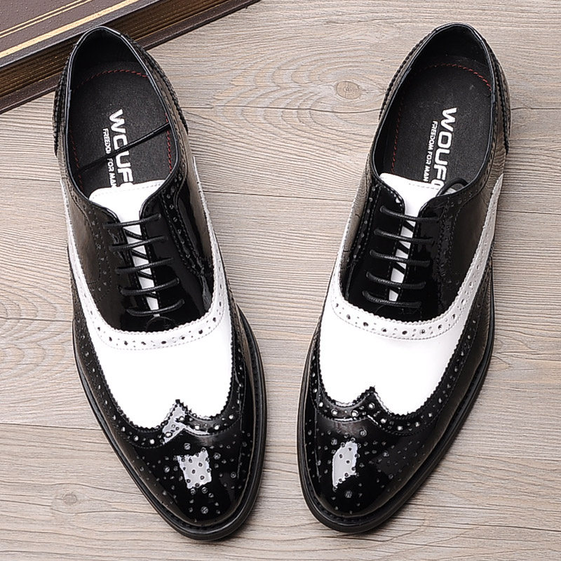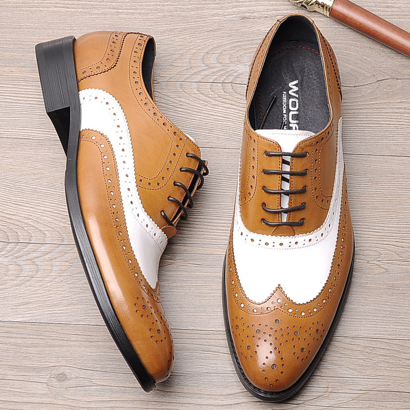新款英伦布洛克款雕花皮鞋尖头真皮欧美黑白拼色正装结婚男鞋透气