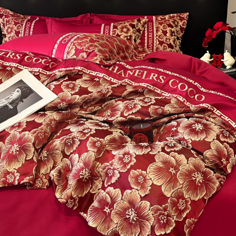 中式婚庆四件套大红色新婚床单被套纯棉高M档结婚床上用品婚房陪