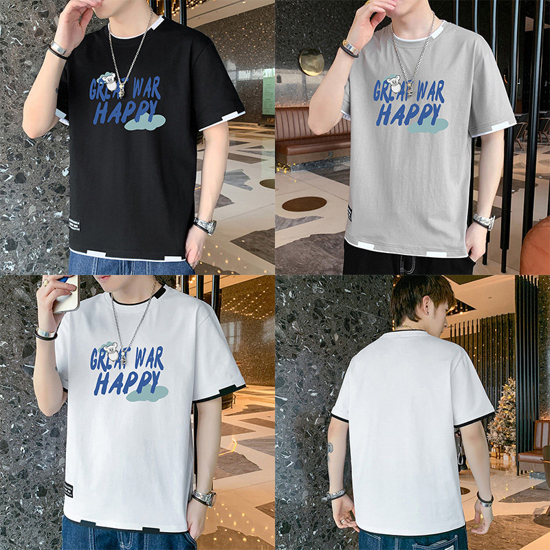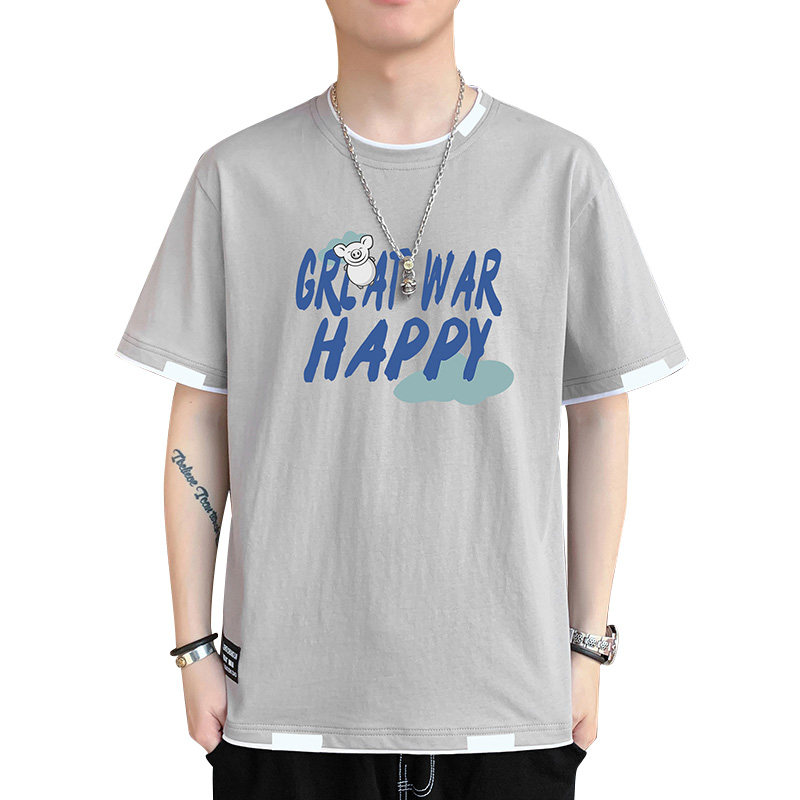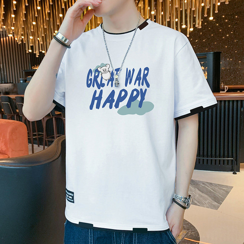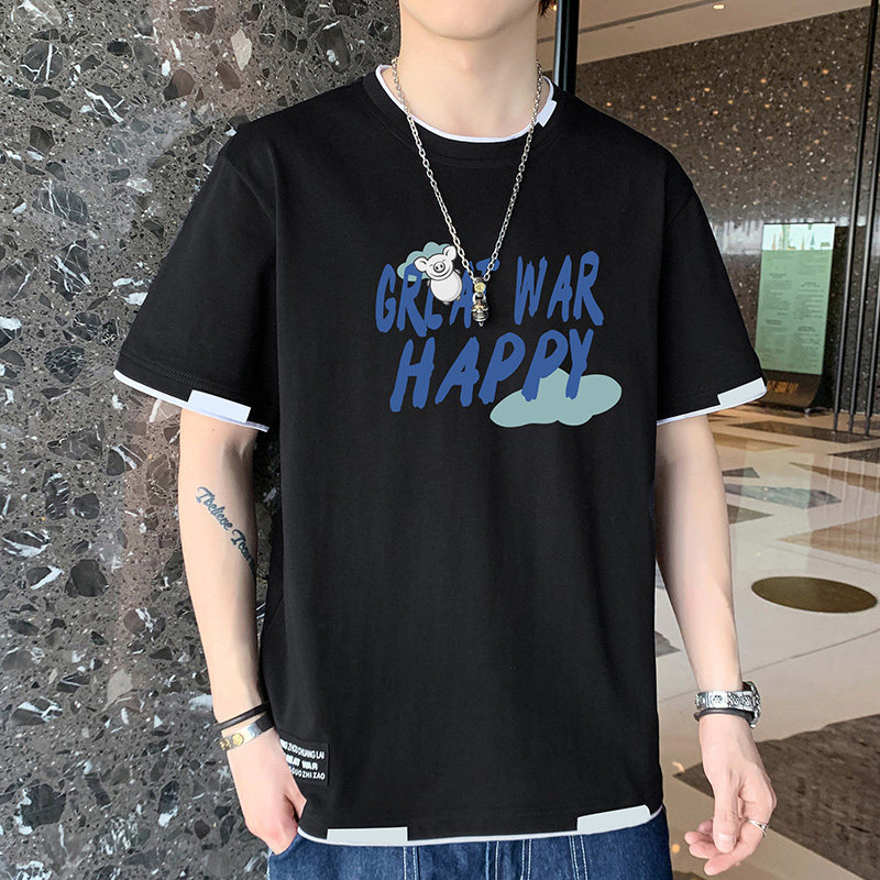短袖男t恤100%纯棉质感夏天青少年假两件2025新款上衣