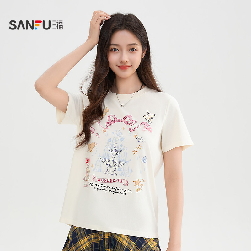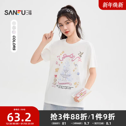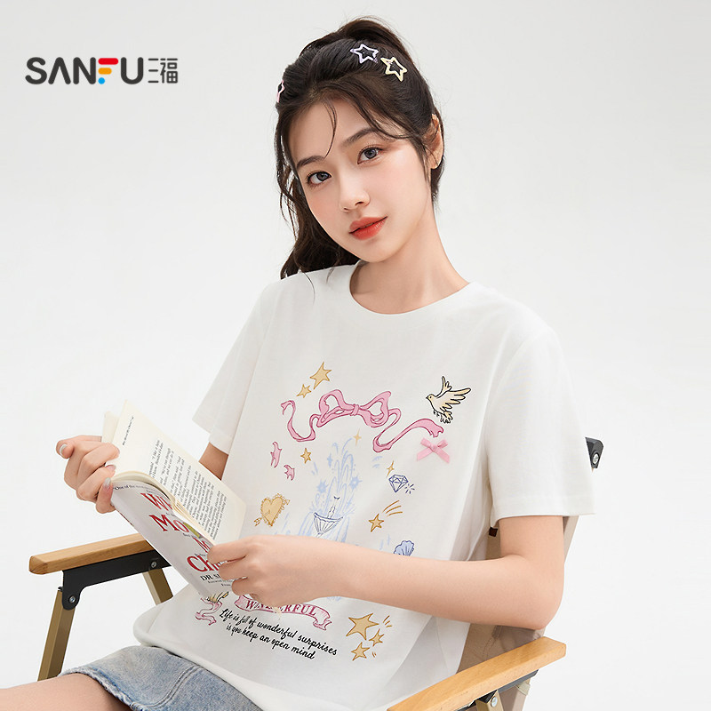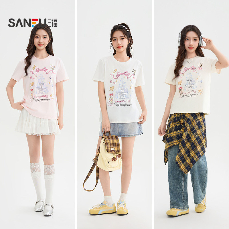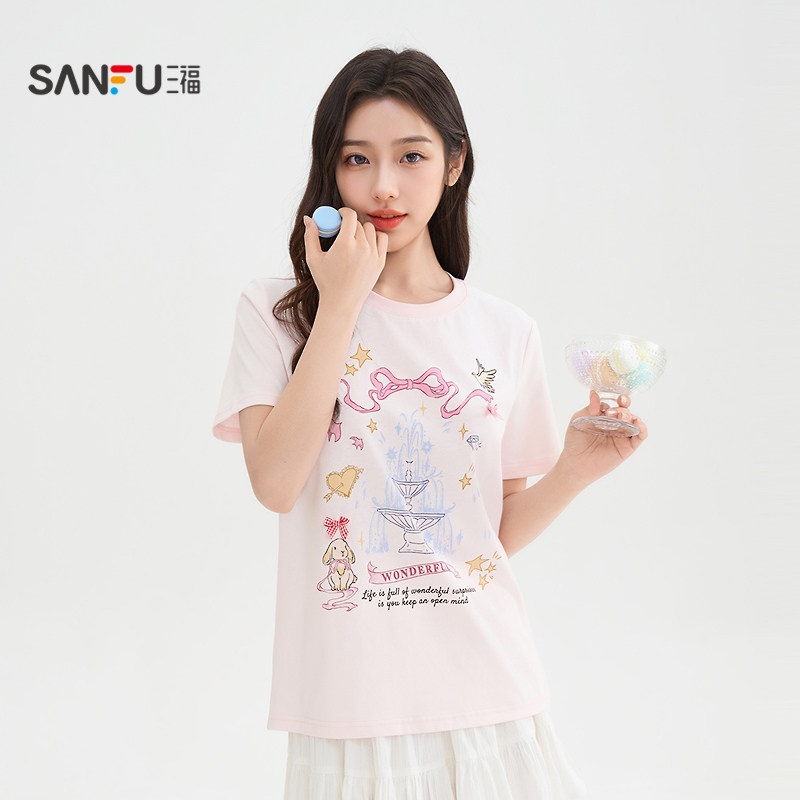 三福短袖女2026新款春季少女印花立体蝴蝶结上衣甜美宽松t恤女装