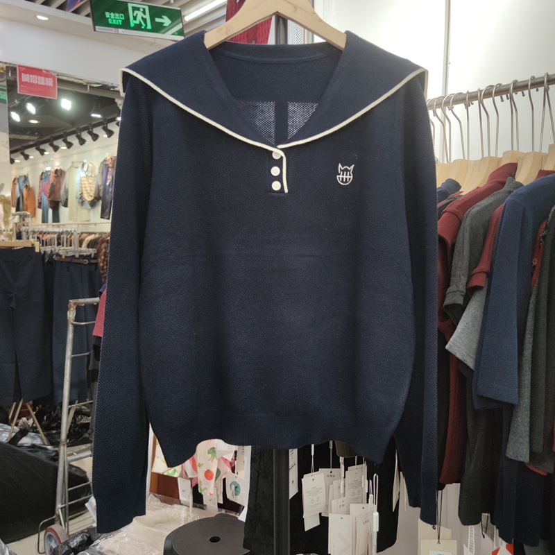 5399休闲设计感简约翻领海军领长袖针织衫女秋季显瘦毛衣套头