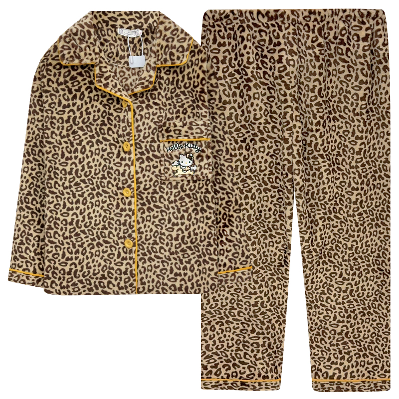 高级感豹纹珊瑚绒睡衣女秋冬季新款加厚保暖可爱hellokitty家居服