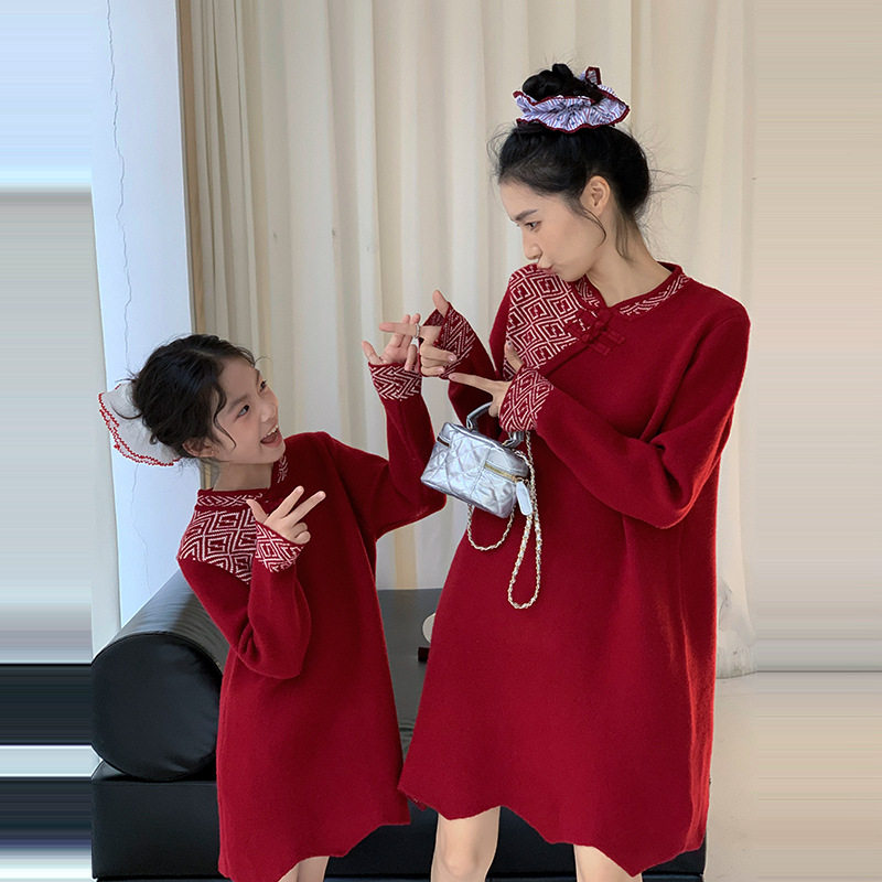民族风亲子装秋冬毛衣一家三口四口针织衫全家福红色母女装连衣裙