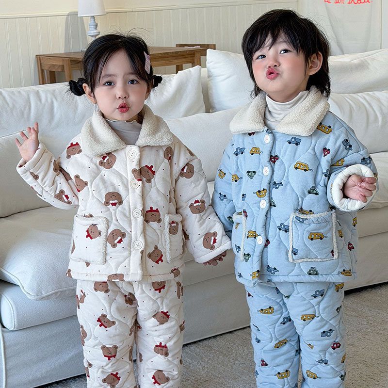 冬季新款儿童三层夹棉睡衣宝宝加绒加厚家居服男女童保暖两件套装