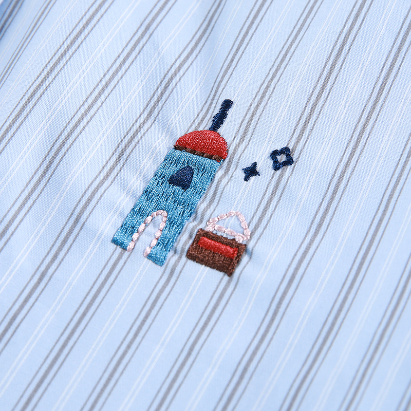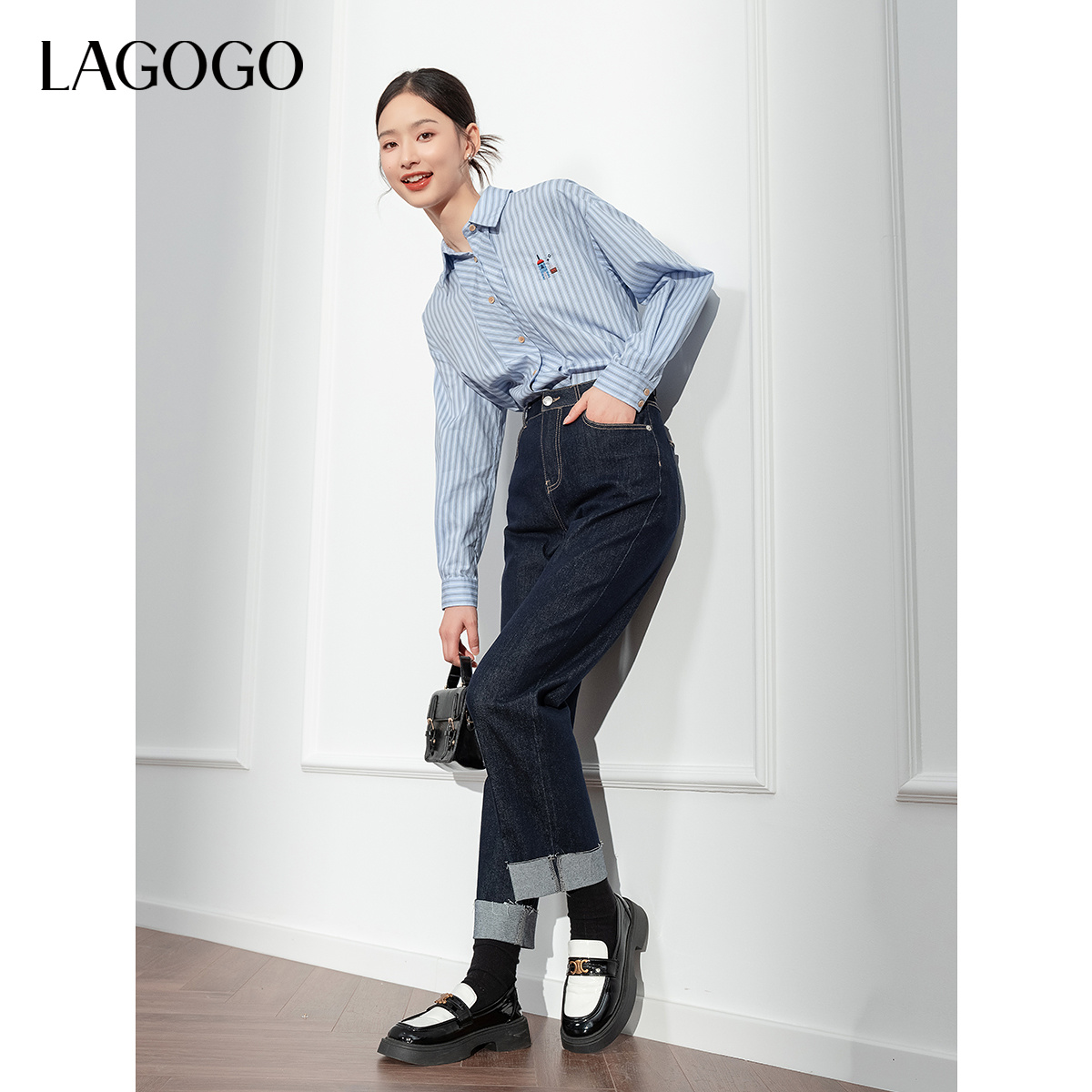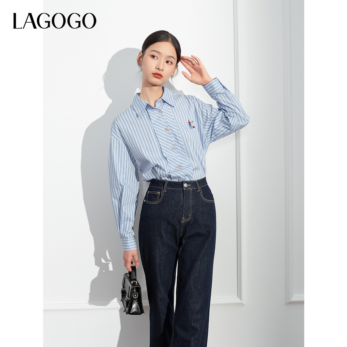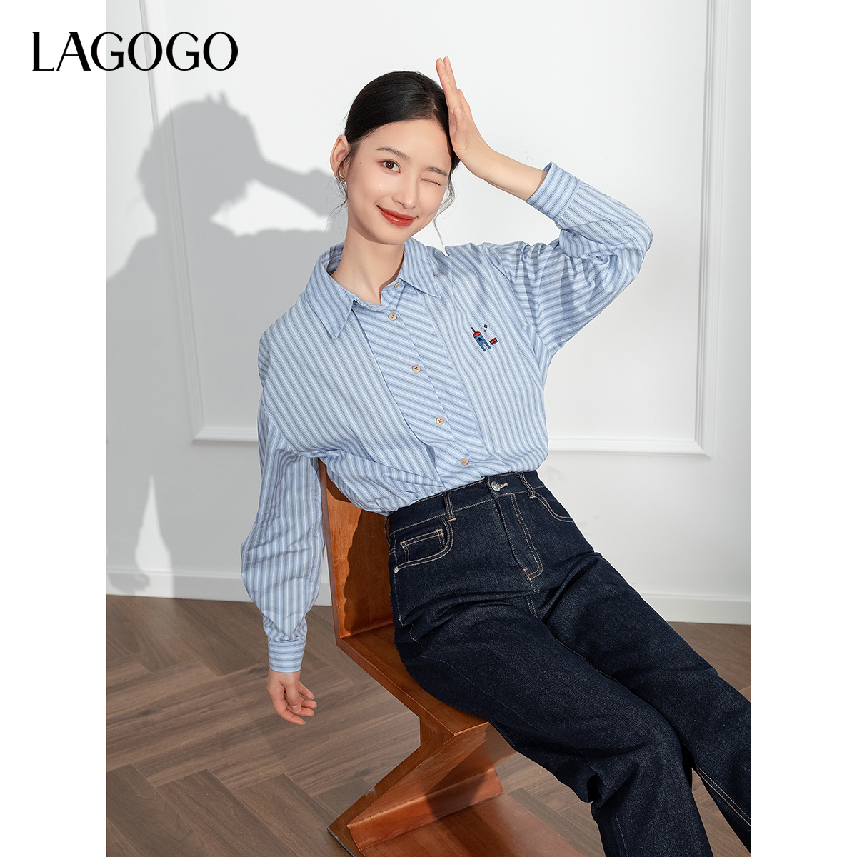 lagogo拉谷谷2024年新款清新蓝白条纹刺绣全棉衬衫女NCCC427G04