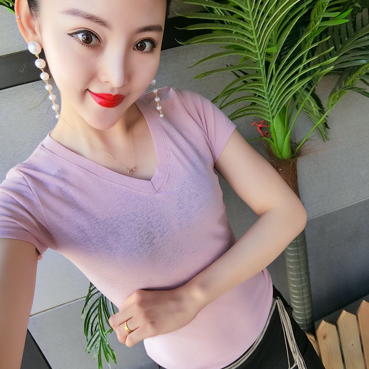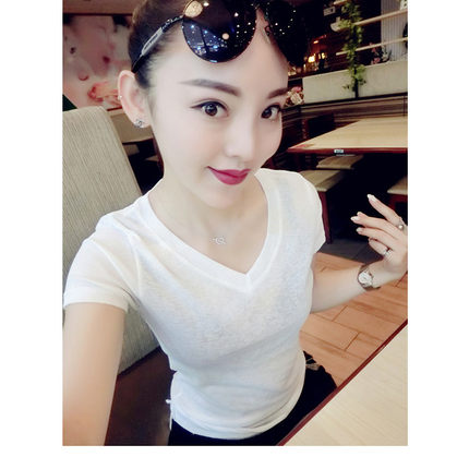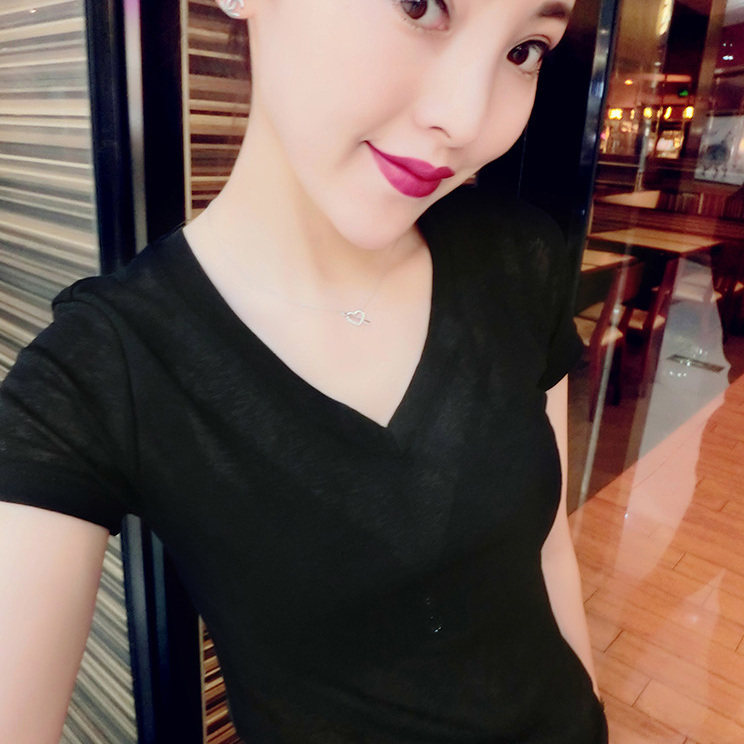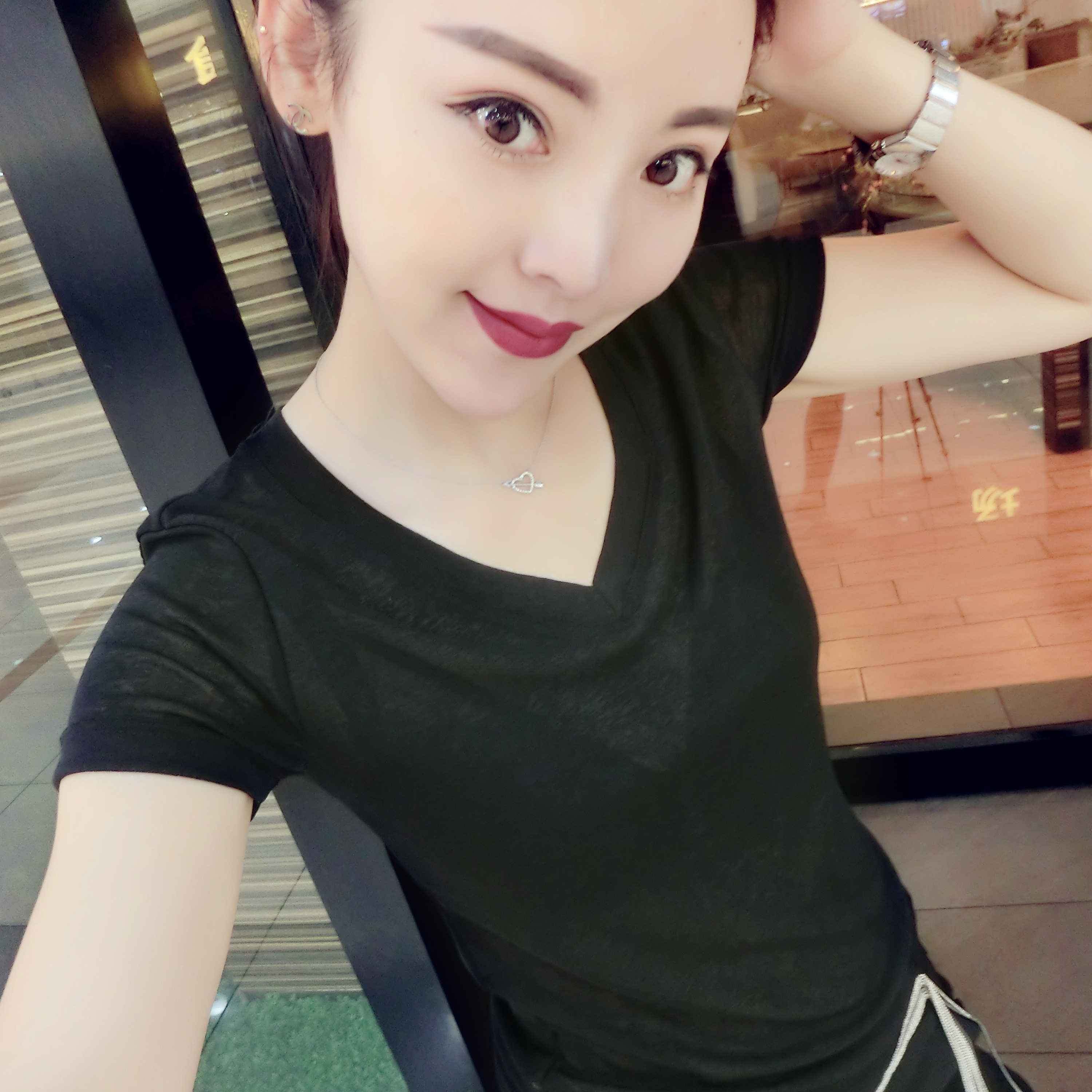 夏季新款薄款微透短袖冰丝V领T恤修身百搭性感弹力设计感上衣女
